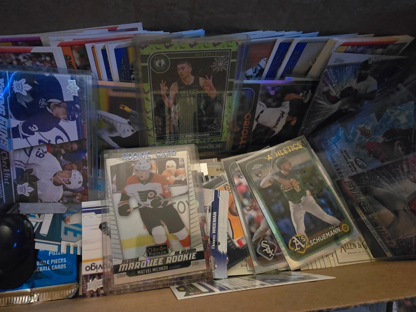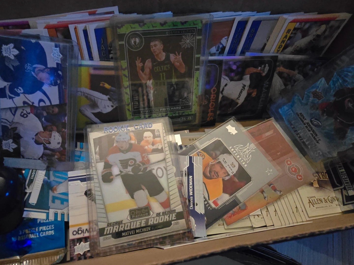 This is a box full of various sports trading cards, including hockey, baseball, and basketball. Many are from brands like Upper Deck, Topps, and Allen & Ginter. Some cards are in protective sleeves, and there's a pack of 1991 Upper Deck. It's a great collection for any sports memorabilia enthusiast!