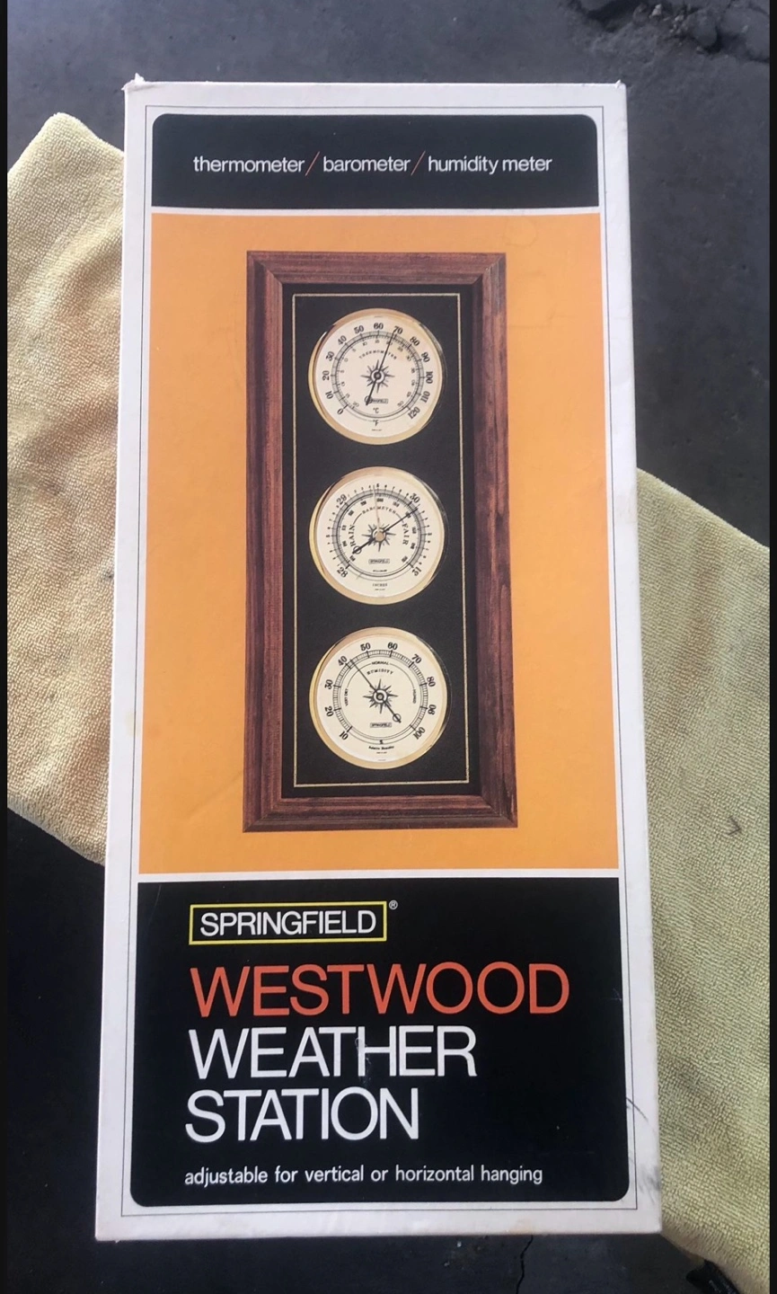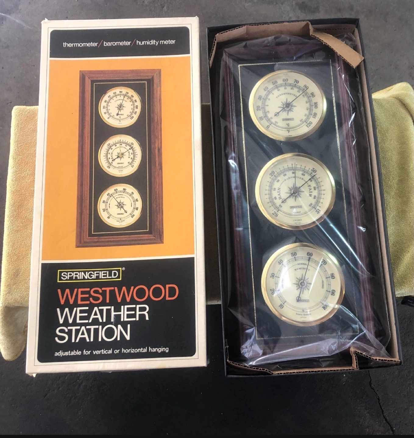 VINTAGE SPRINGFIELD WEATHER STATION METER 3 DIAL: Includes thermometer, barometer, and humidity meter. Wooden frame. Adjustable for vertical or horizontal hanging. New, in box.