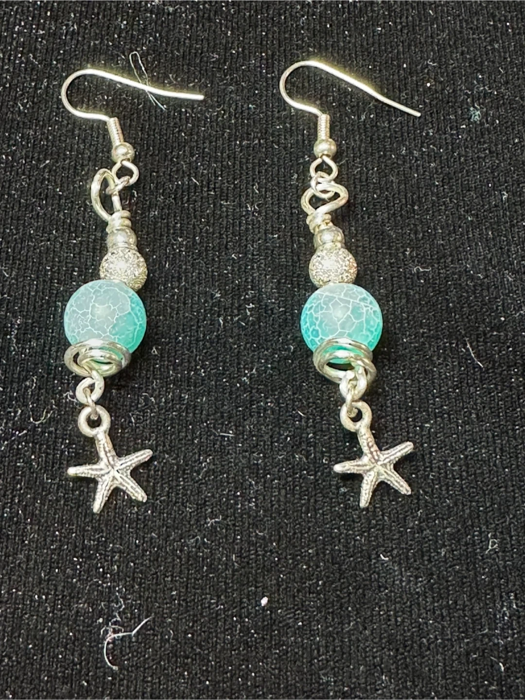 Selling a pair of handmade earrings! They feature silver hooks, a decorative silver bead, a n agate pretty blue crackle bead, and a cute little starfish charm