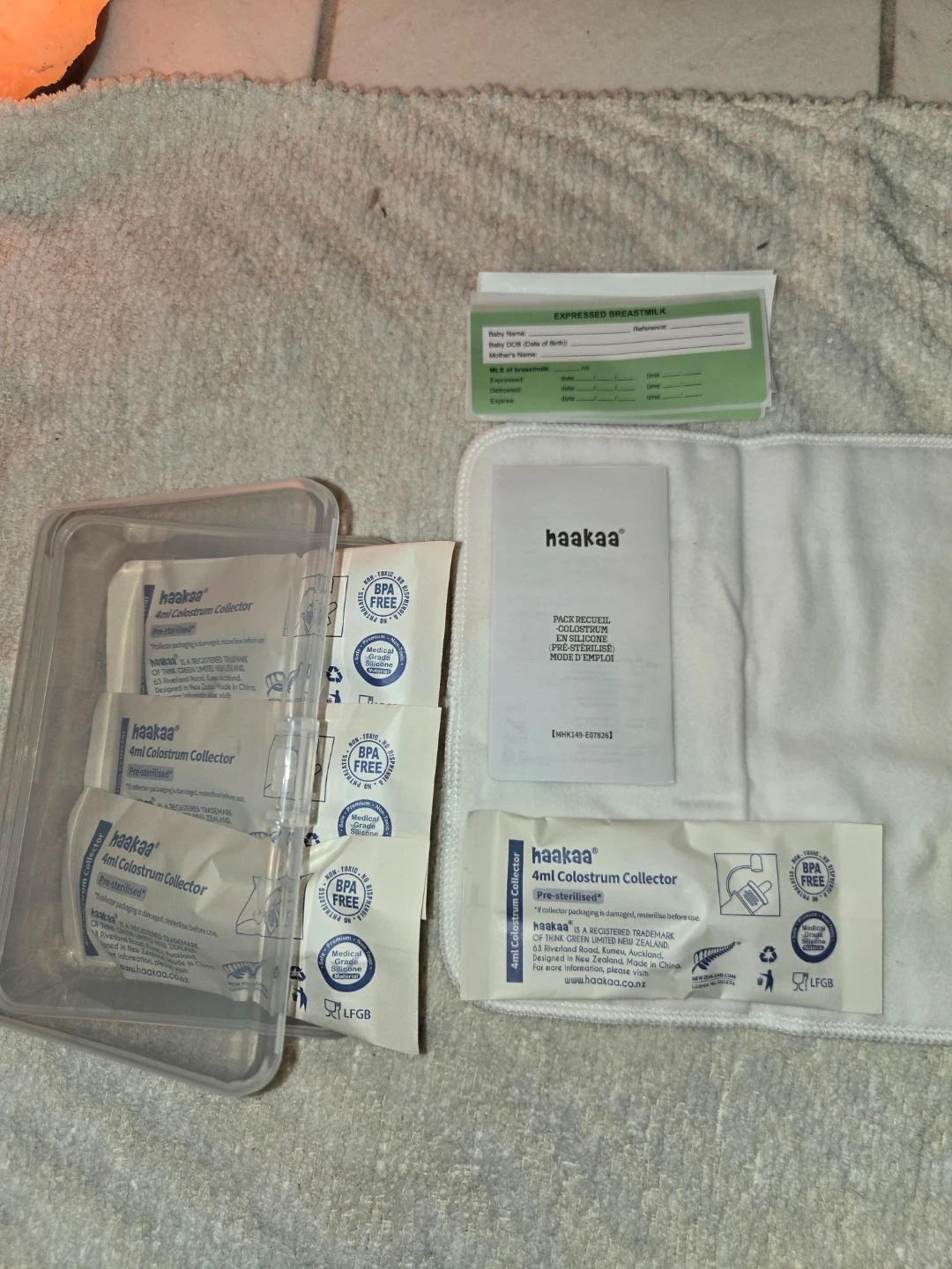 Haakaa 4ml colostrum collectors are pre-sterilized and BPA-free. Medical grade silicone construction. These collectors are designed in New Zealand. Set of 4 unopened collectors with unused flannel washcloth, label stickers, & user manual.