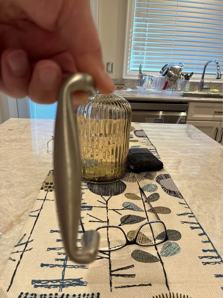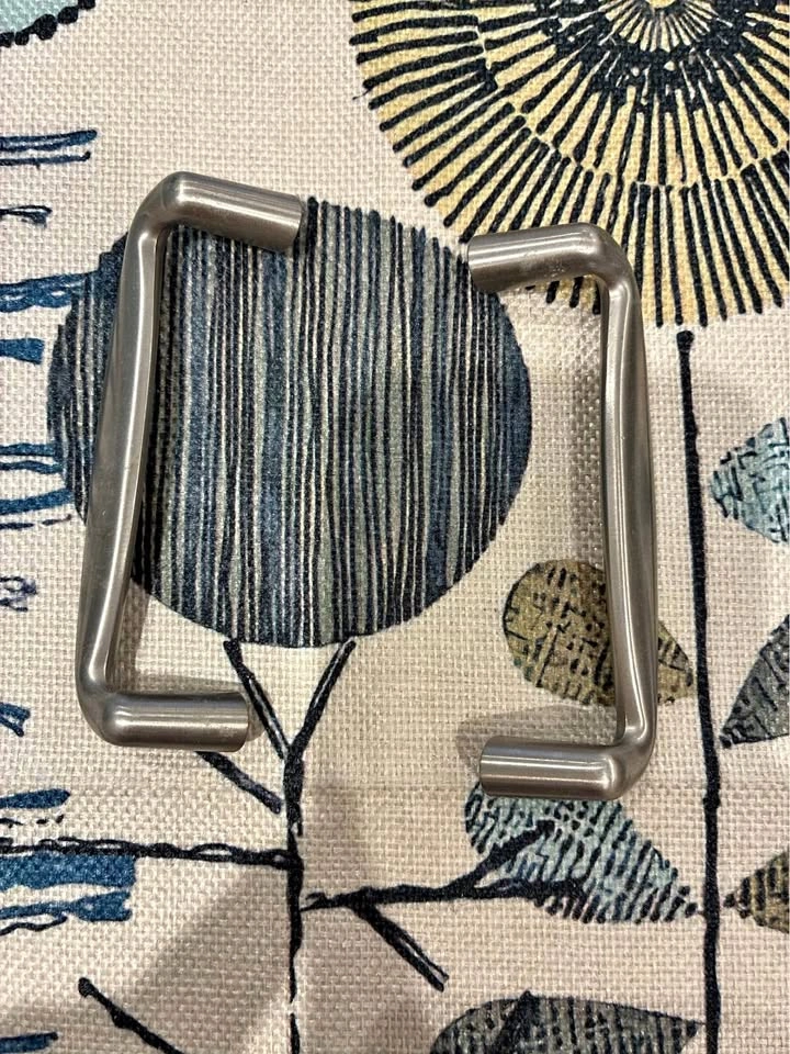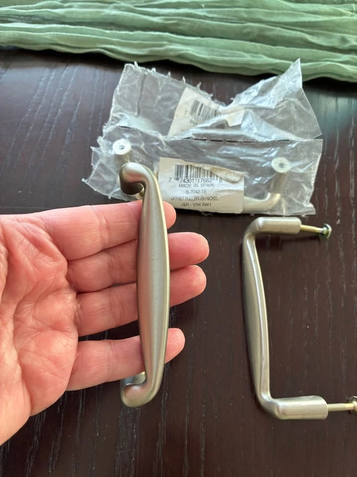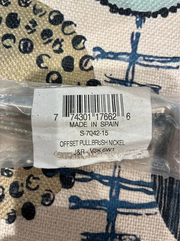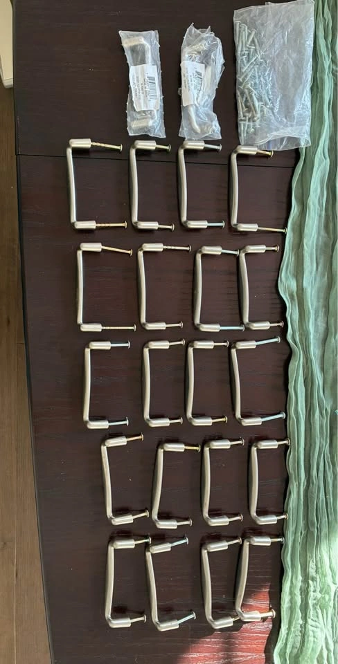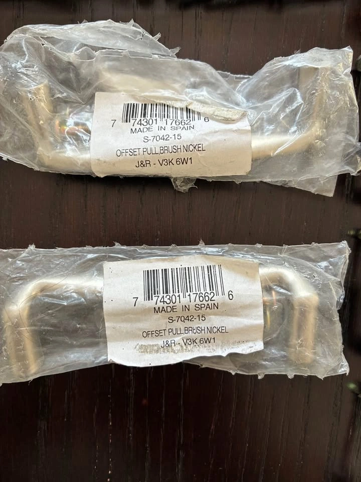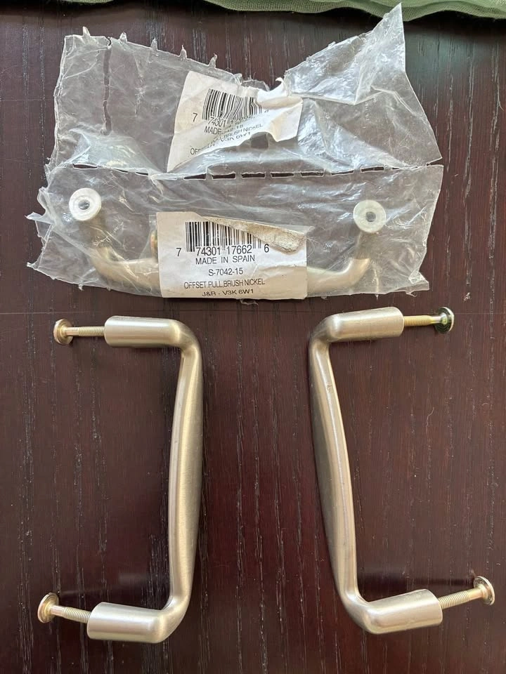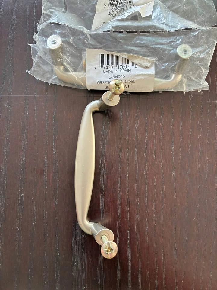 New, never used brushed nickel drawer / door handles. 4" from screw to screw