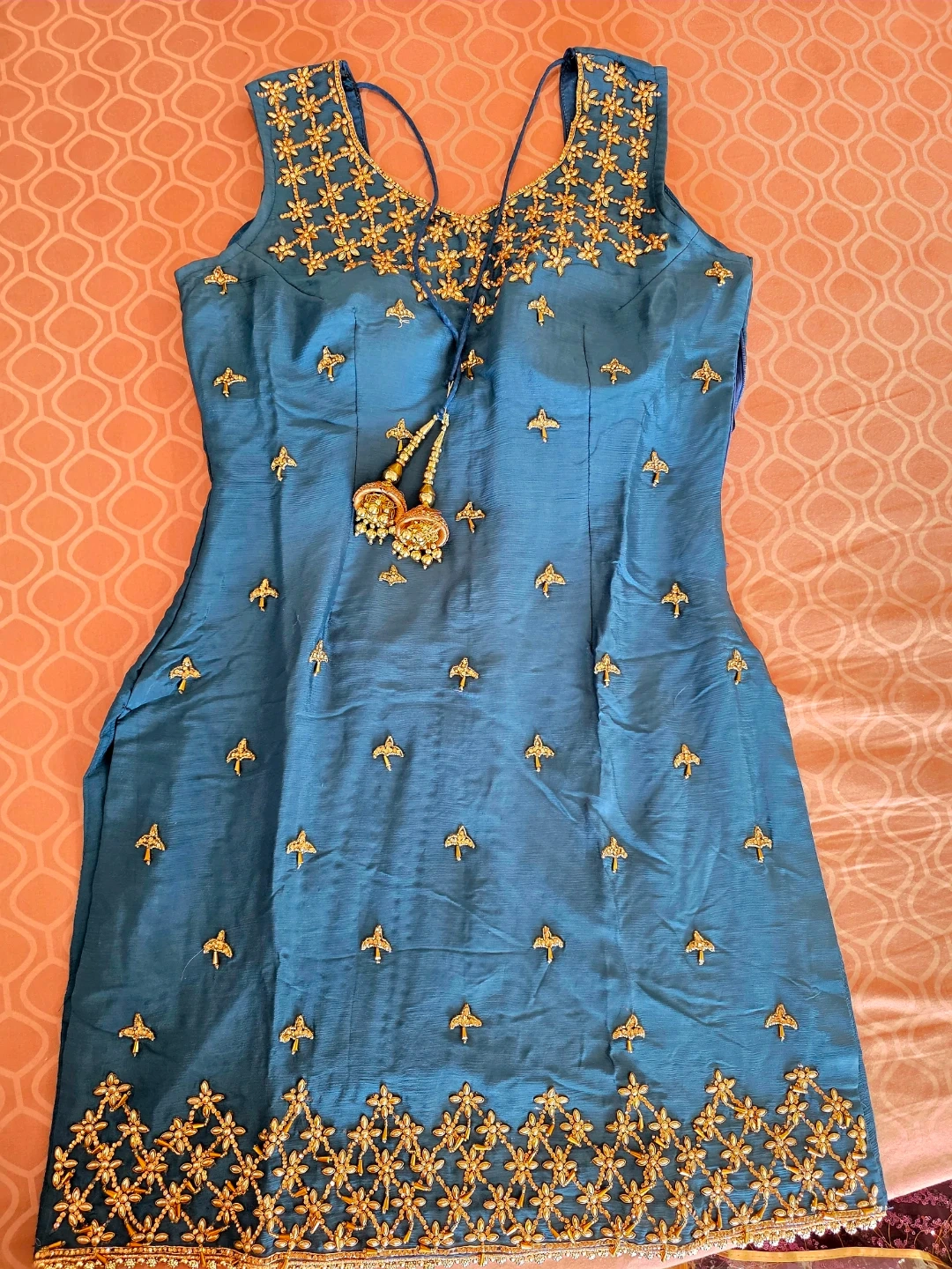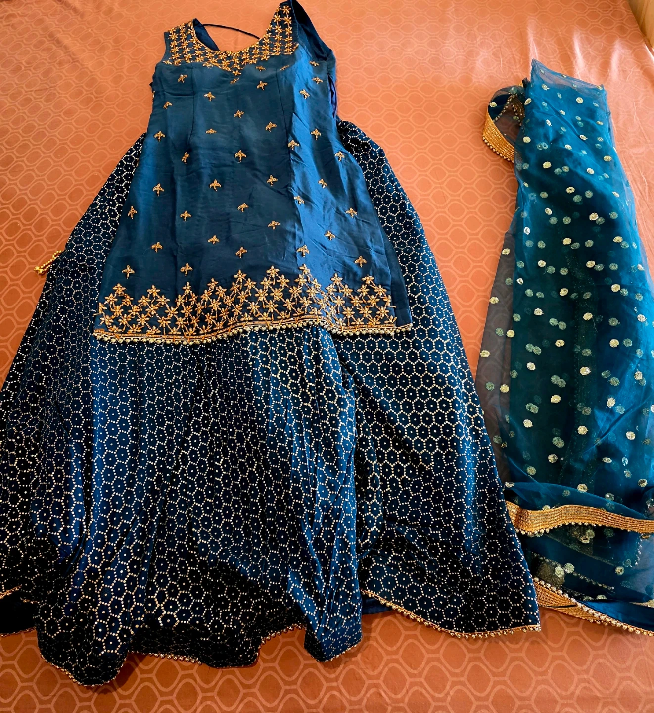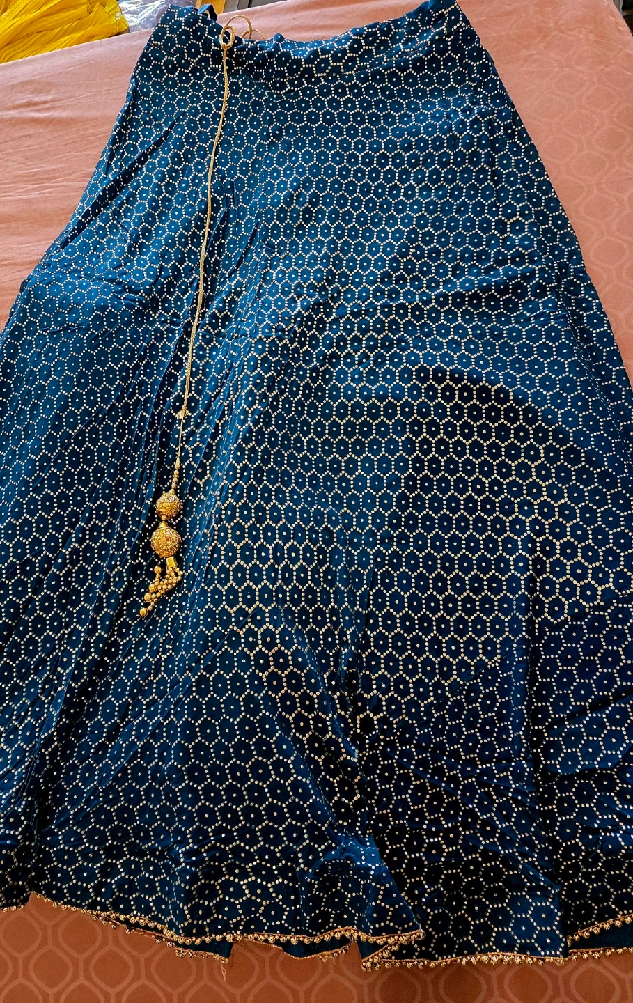 This three-piece outfit includes a sleeveless blue kurti with gold embroidery, a matching blue skirt featuring a geometric pattern, and a sheer blue dupatta with gold accents. It's perfect for festive occasions. Just wore once