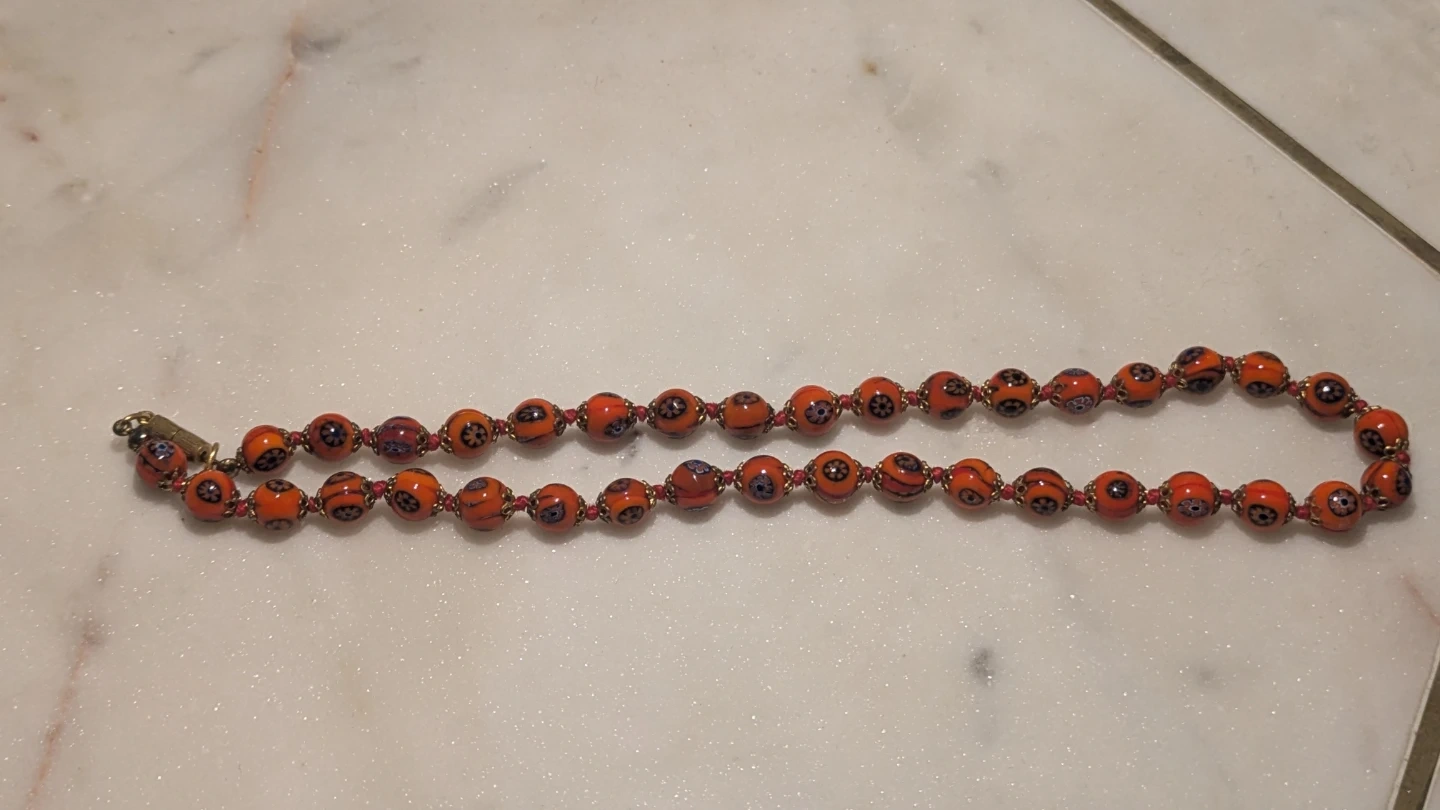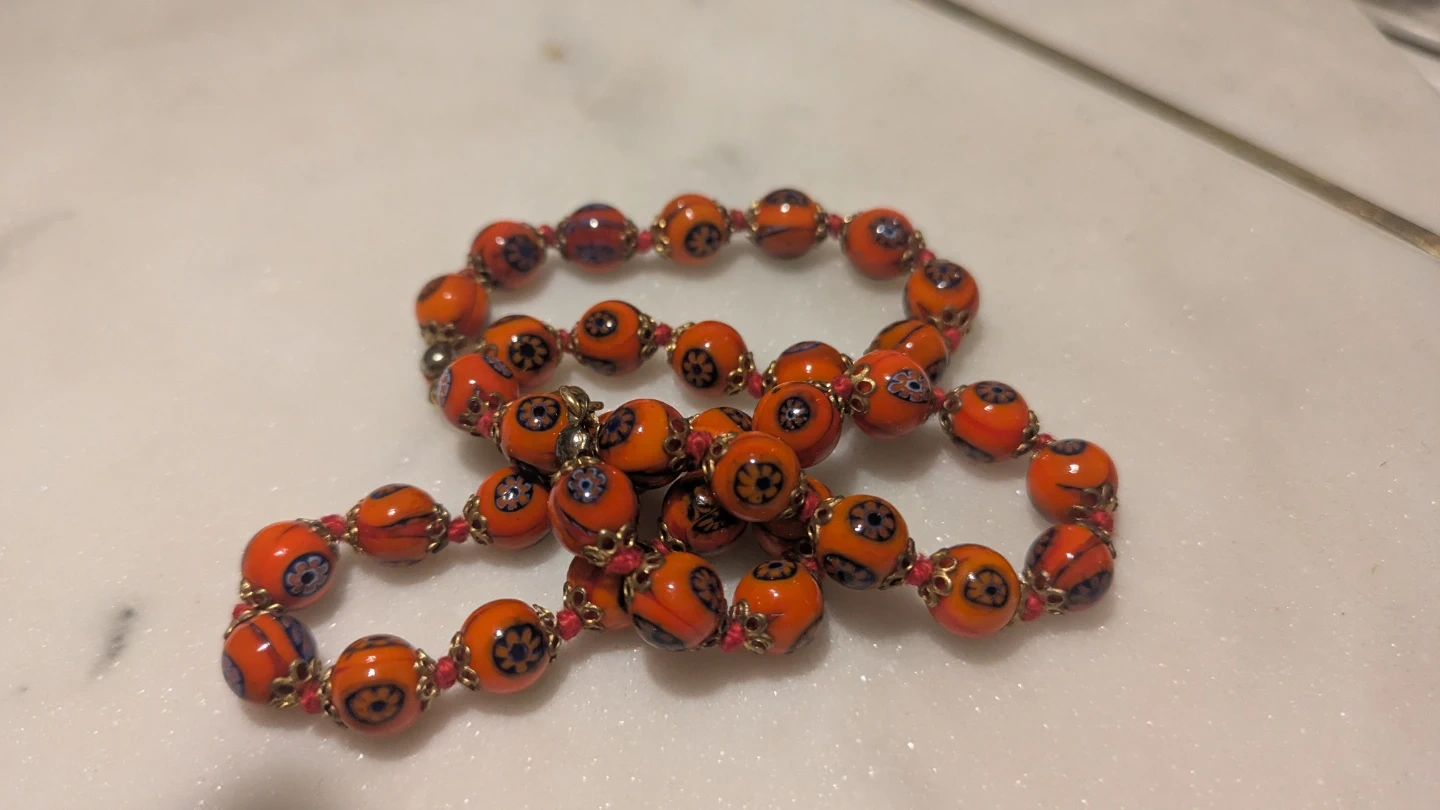 A lovely beaded necklace with vibrant orange beads featuring a delicate blue and black floral pattern. The beads are strung on red cord with small gold-toned spacers and are hand knotted.It's a unique accessory that adds a pop of colour!