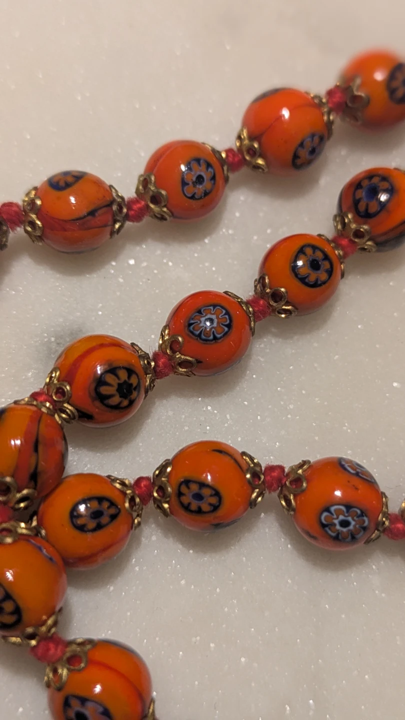 A lovely beaded necklace with vibrant orange beads featuring a delicate blue and black floral pattern. The beads are strung on red cord with small gold-toned spacers and are hand knotted.It's a unique accessory that adds a pop of colour!