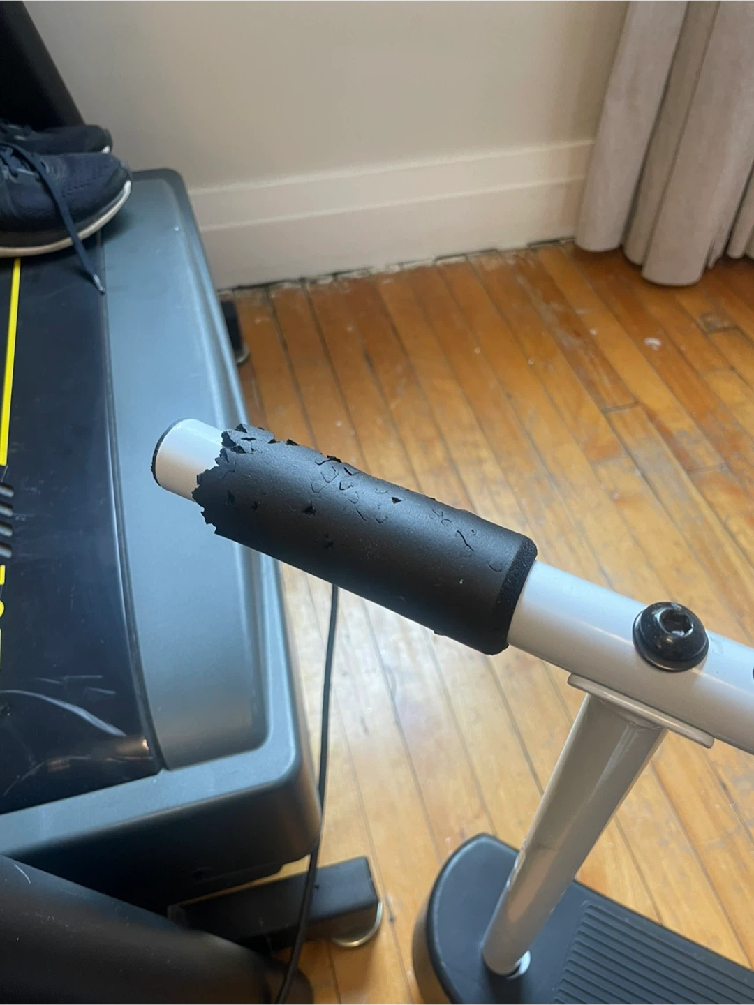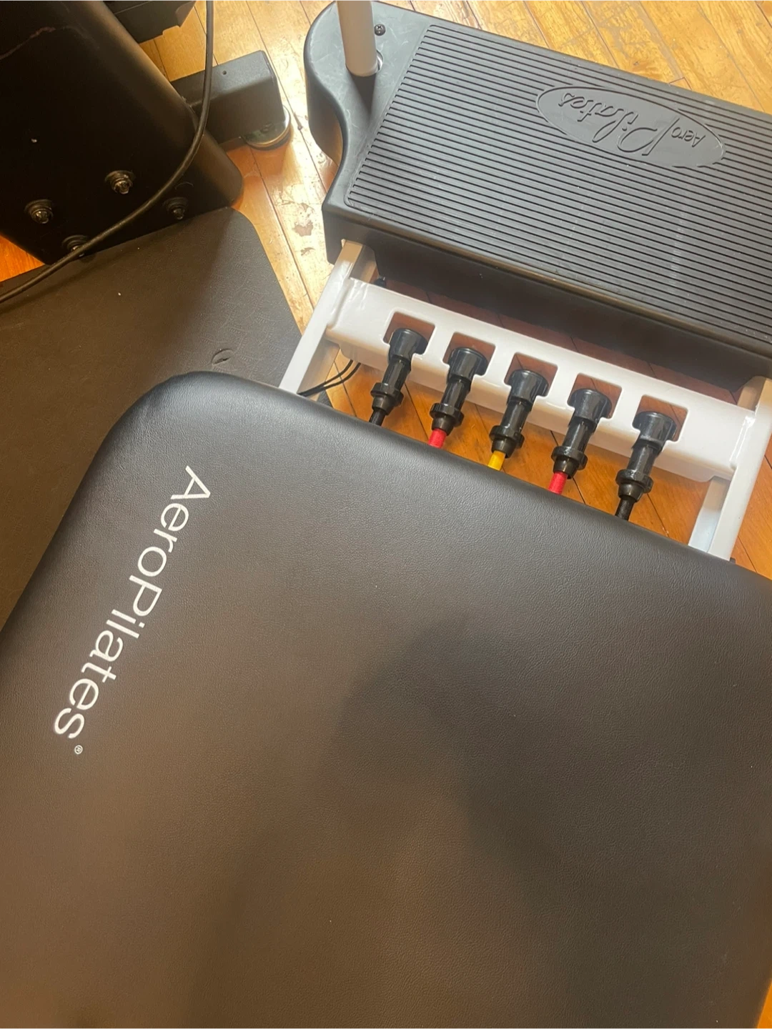 This AeroPilates reformer is designed for home workouts. It comes with a set of resistance cords in various colours. Some wear is visible on the foot bar grips.