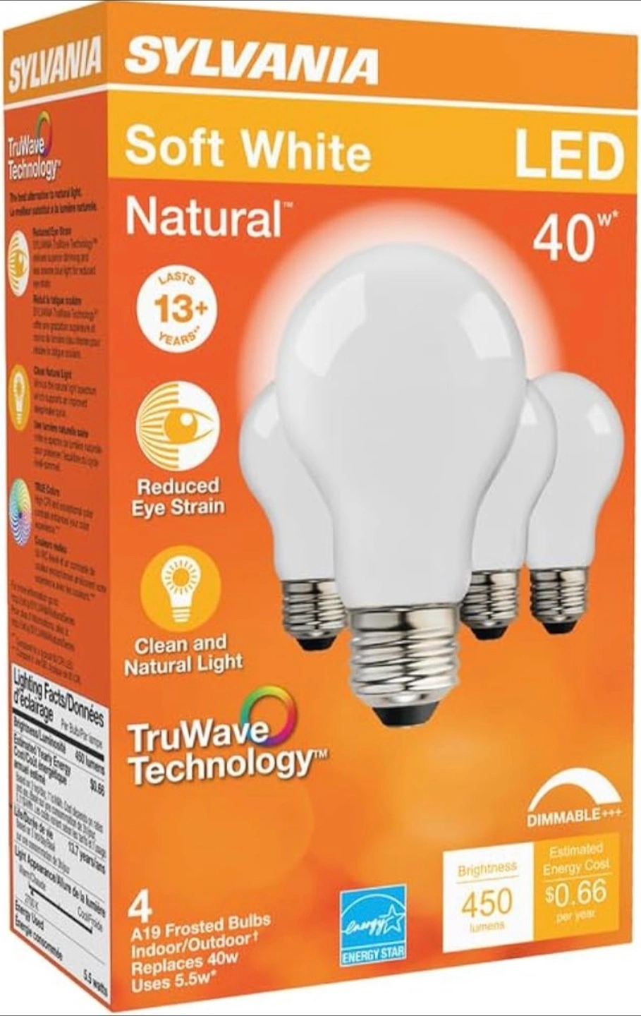 Energy Star rated LED bulbs. 4-pack of frosted bulbs. Dimmable. Indoor/outdoor use. Replaces 40W incandescent bulbs. Soft white natural light. Reduced eye strain. Lasts 13+ years.