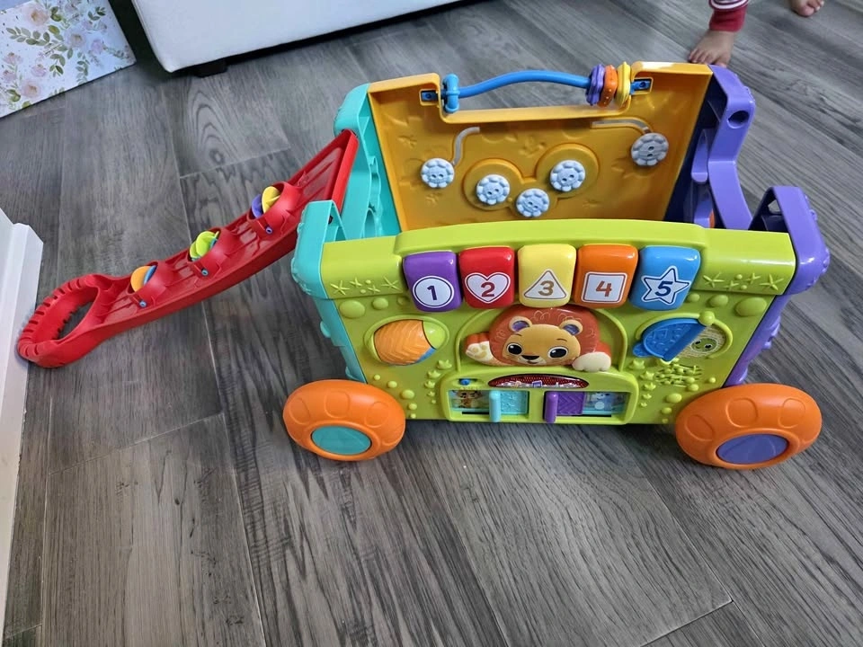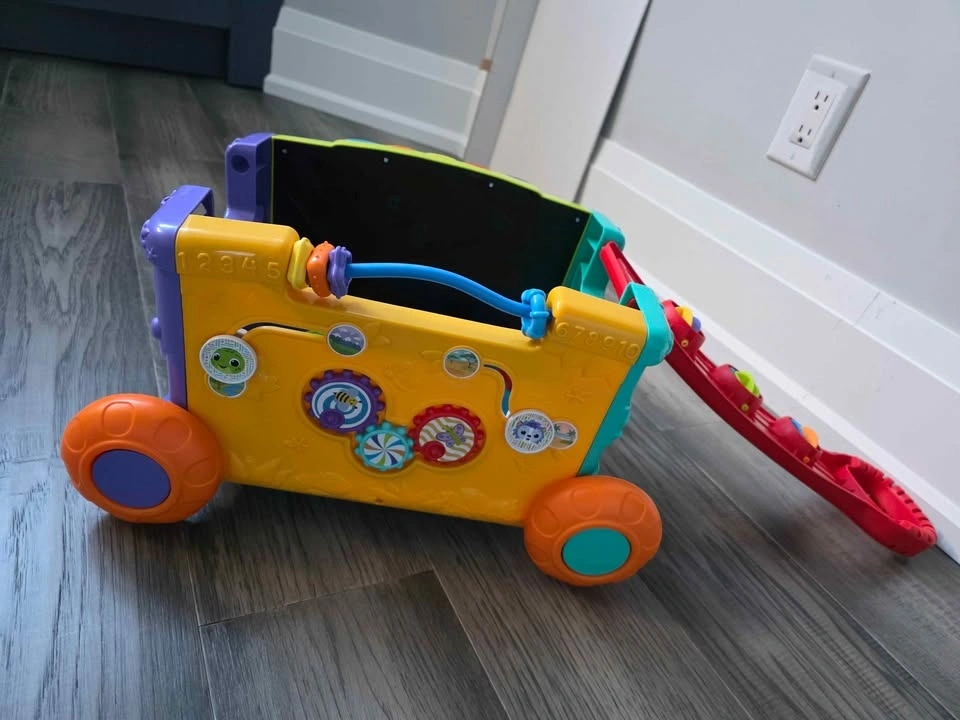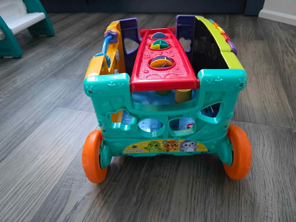 Interactive learning wagon for toddlers. Can be used as a push walker or activity toy. Includes shape sorter pieces and multiple activity panels that teach numbers, animals, colors, and music. Music, sounds, and lights all work perfectly. Multiple interactive buttons and activities. Shape sorting pieces included. Wheels roll smoothly – great for early walkers. Clean and from a smoke-free home. Great toy for toddlers 12–36 months. Helps with motor skills, learning shapes, and early problem solving. Pickup in Scarborough - Meadowvale and Ellesmere.