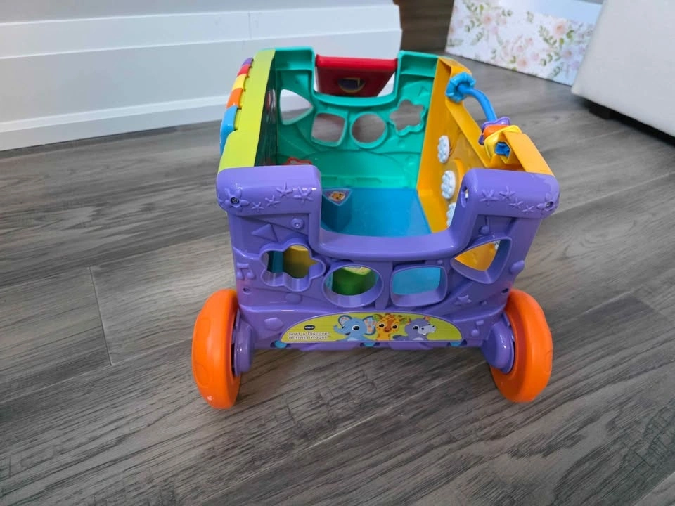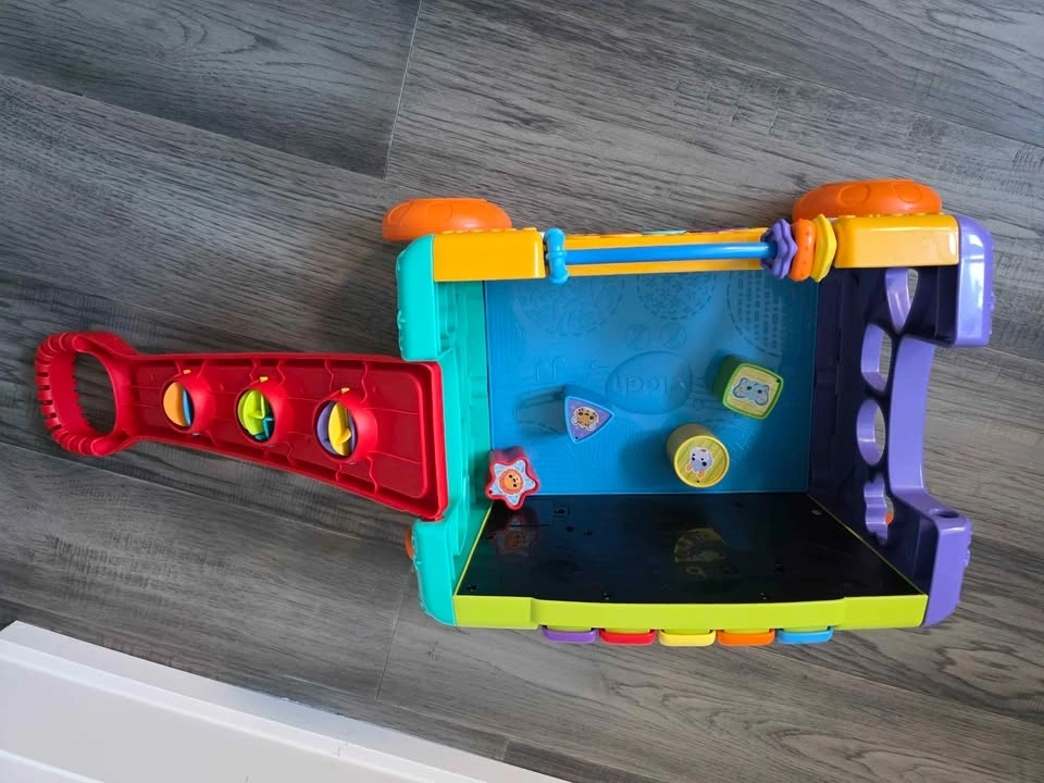 Interactive learning wagon for toddlers. Can be used as a push walker or activity toy. Includes shape sorter pieces and multiple activity panels that teach numbers, animals, colors, and music. Music, sounds, and lights all work perfectly. Multiple interactive buttons and activities. Shape sorting pieces included. Wheels roll smoothly – great for early walkers. Clean and from a smoke-free home. Great toy for toddlers 12–36 months. Helps with motor skills, learning shapes, and early problem solving. Pickup in Scarborough - Meadowvale and Ellesmere.
