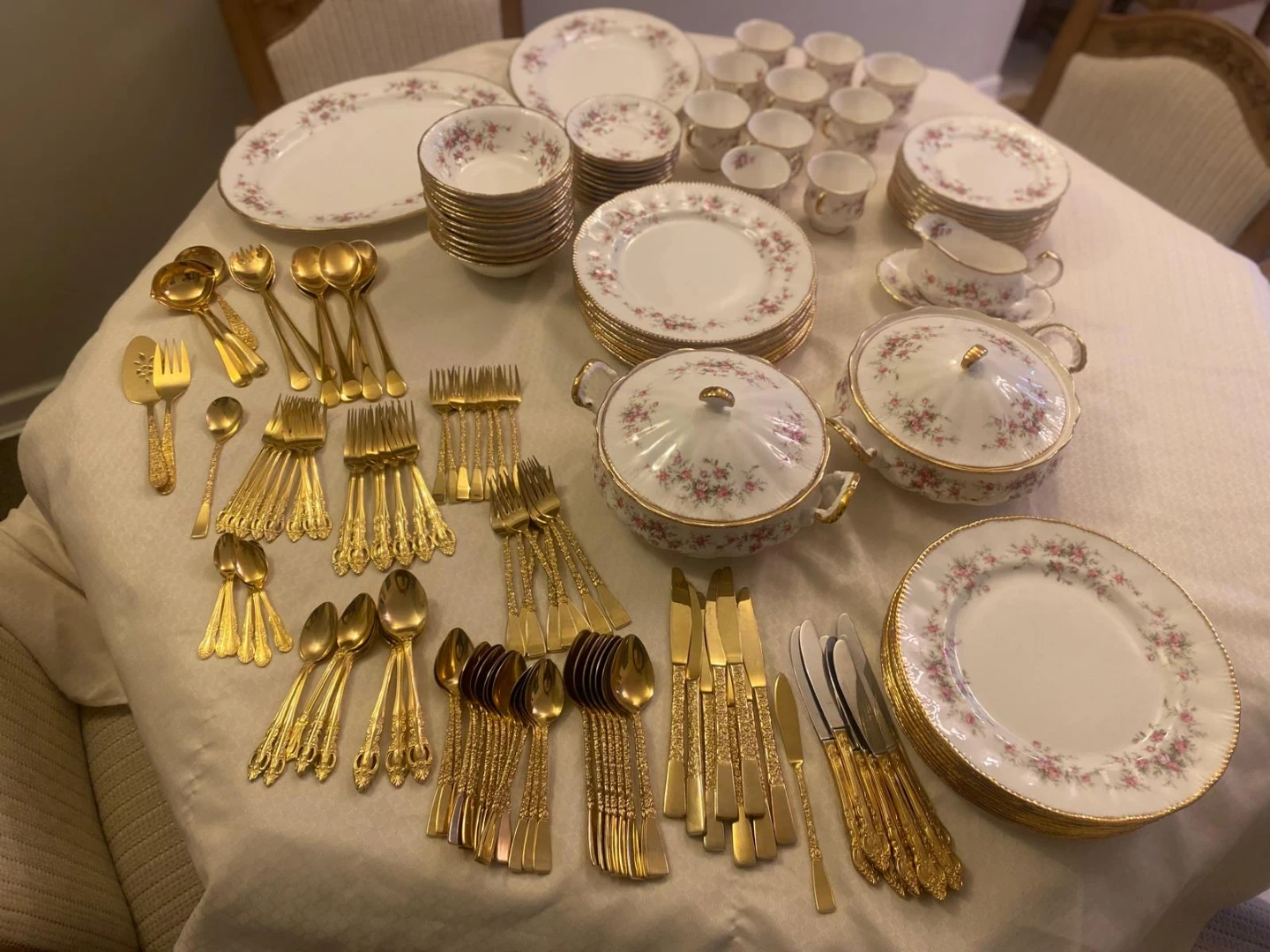 Beautiful Royal Albert bone china dinnerware set in the Victoriana Rose pattern. This extensive set features a delicate floral design with gold trim and includes numerous plates, bowls, cups, saucers, serving dishes, and a full set of gold-plated cutlery. Perfect for formal dining or special occasions!