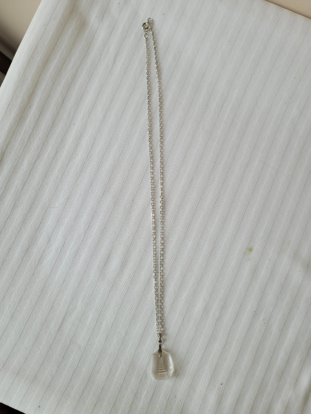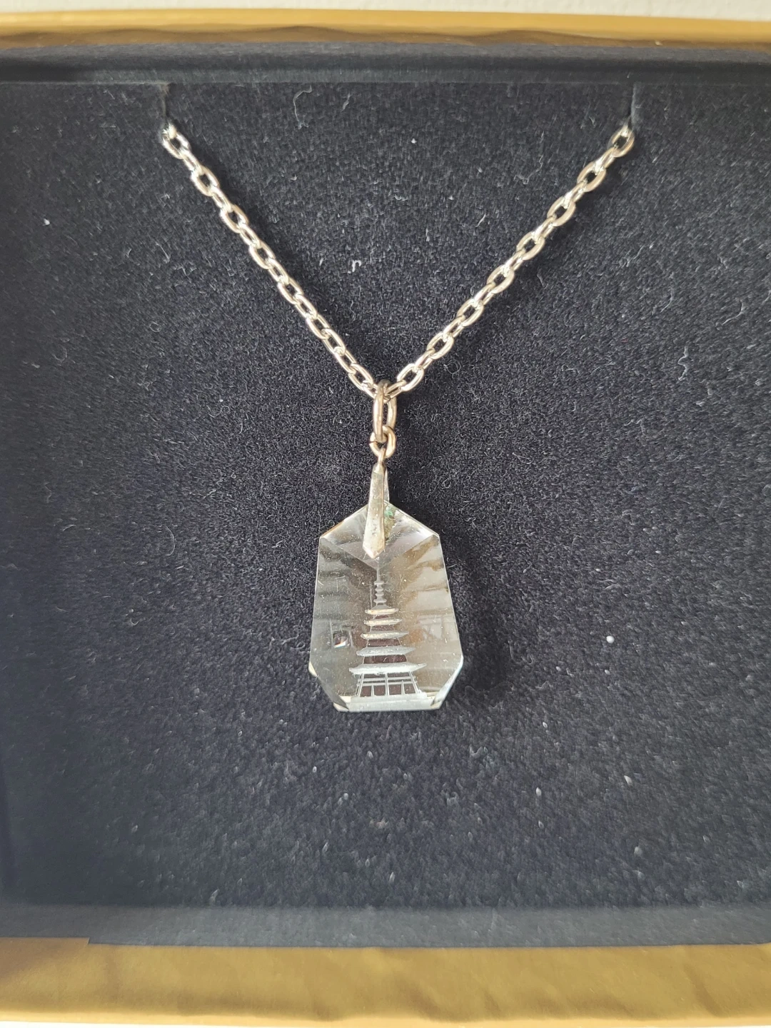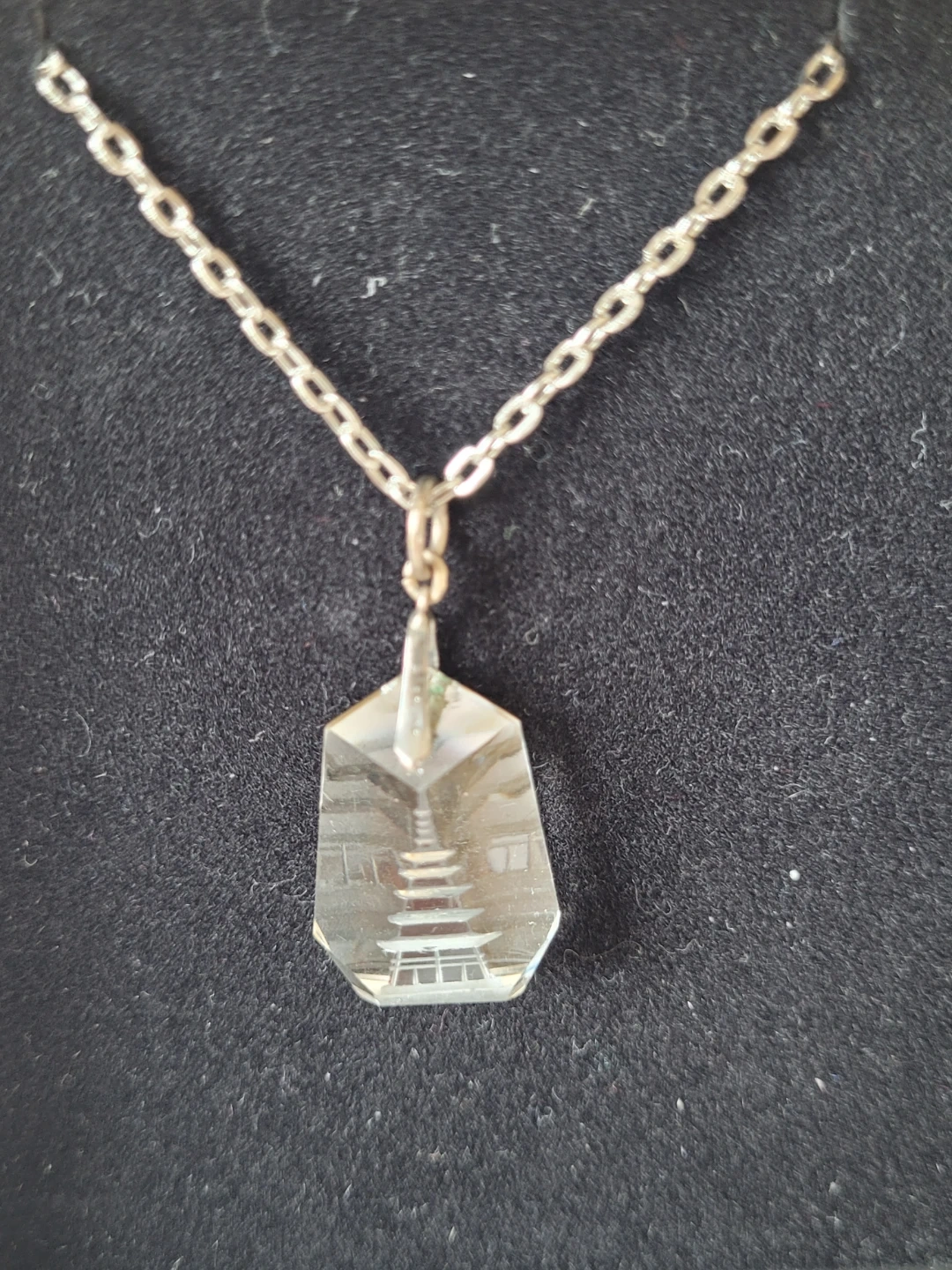 This necklace features a clear crystal pendant with an etched pagoda design. The 20 inch chain is silver-toned. It's a unique accessory for any jewellery collection.