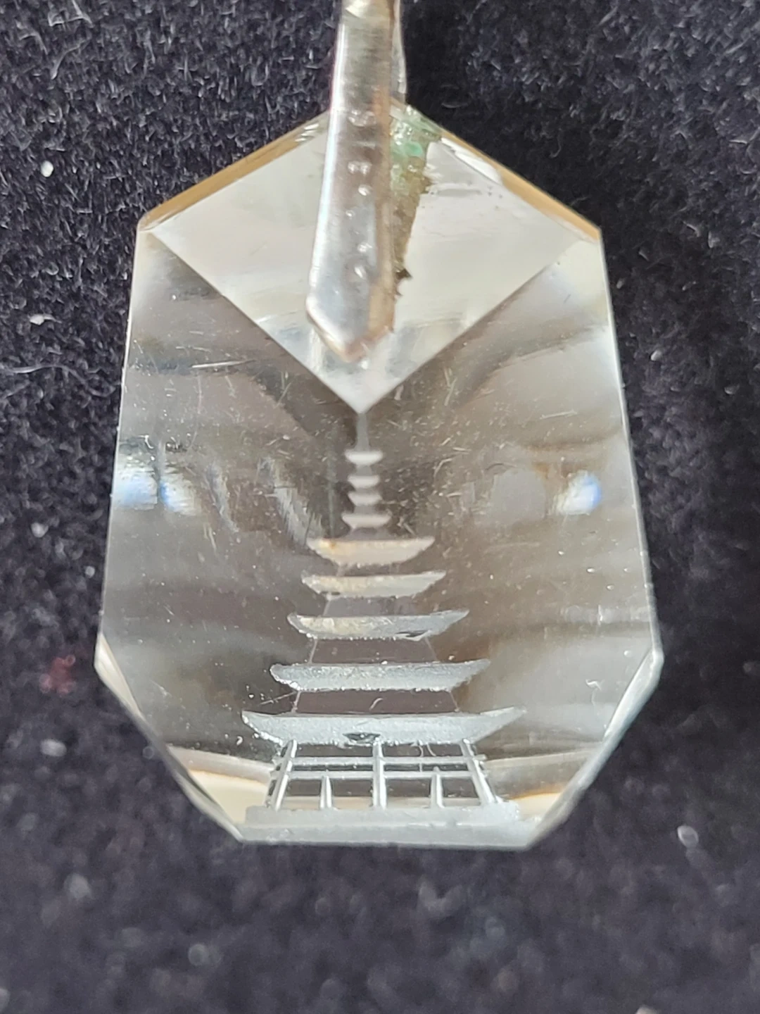 This necklace features a clear crystal pendant with an etched pagoda design. The 20 inch chain is silver-toned. It's a unique accessory for any jewellery collection.
