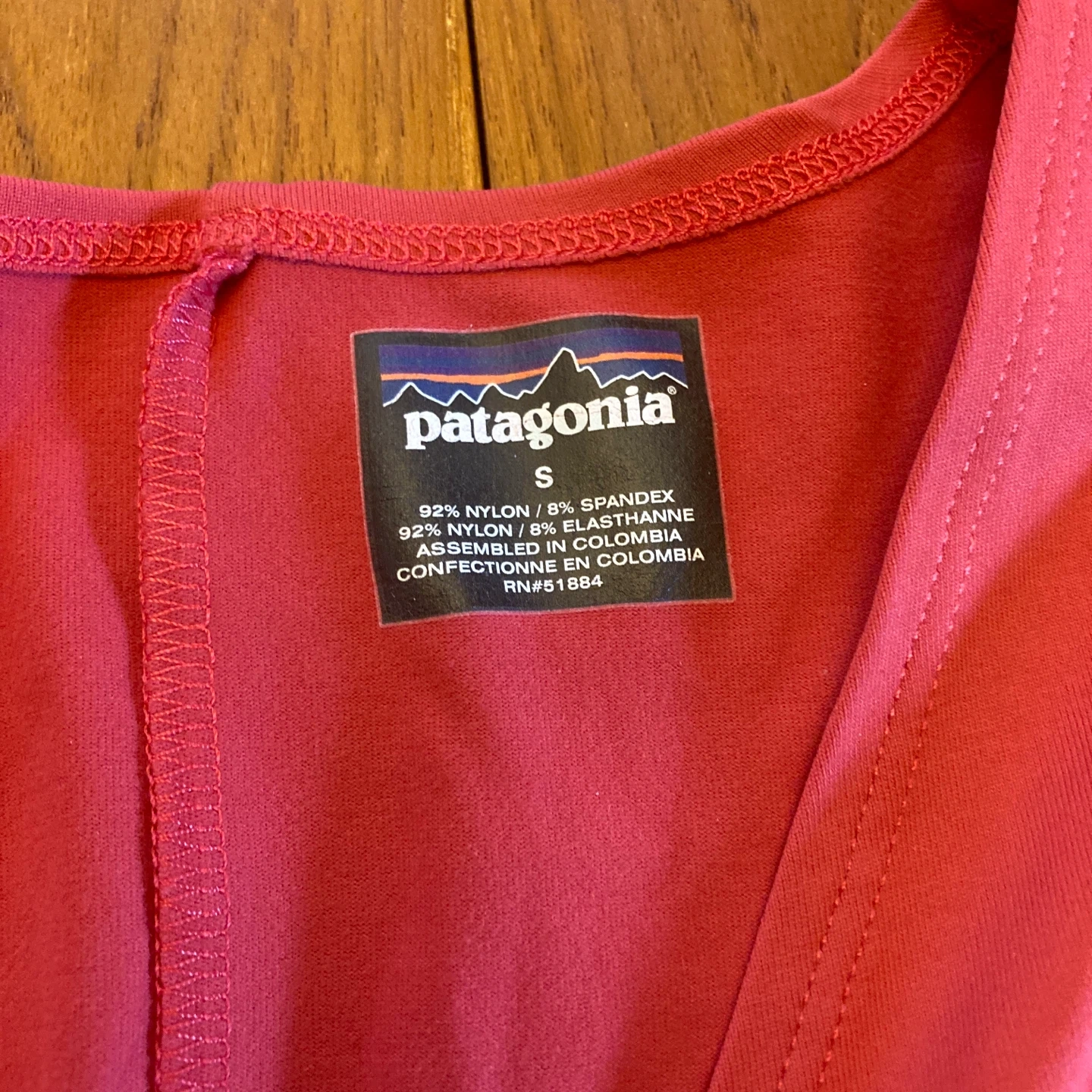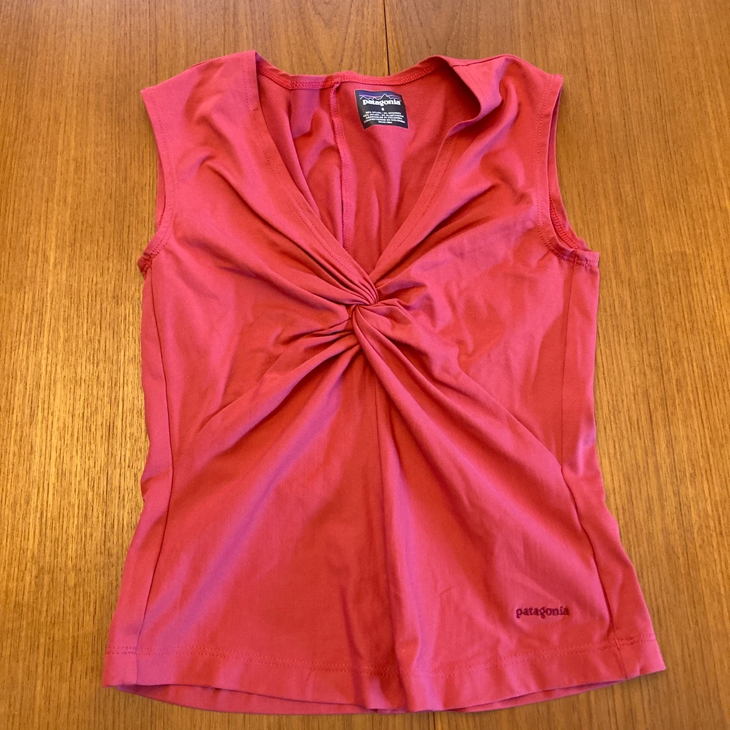 This is a coral pink sleeveless top from Patagonia. It's made with a blend of 92% nylon and 8% spandex. The front features a stylish twist detail. It's a size small.