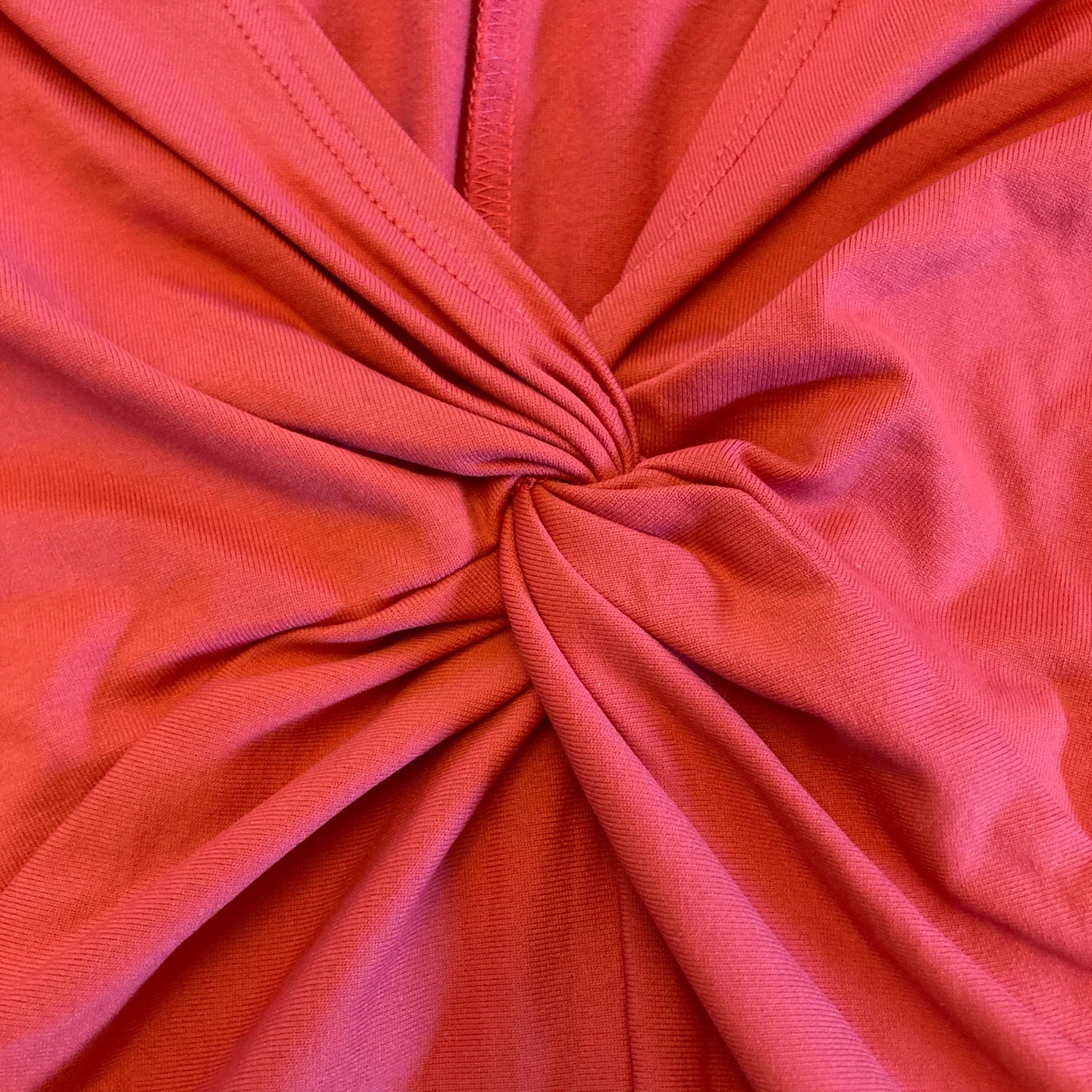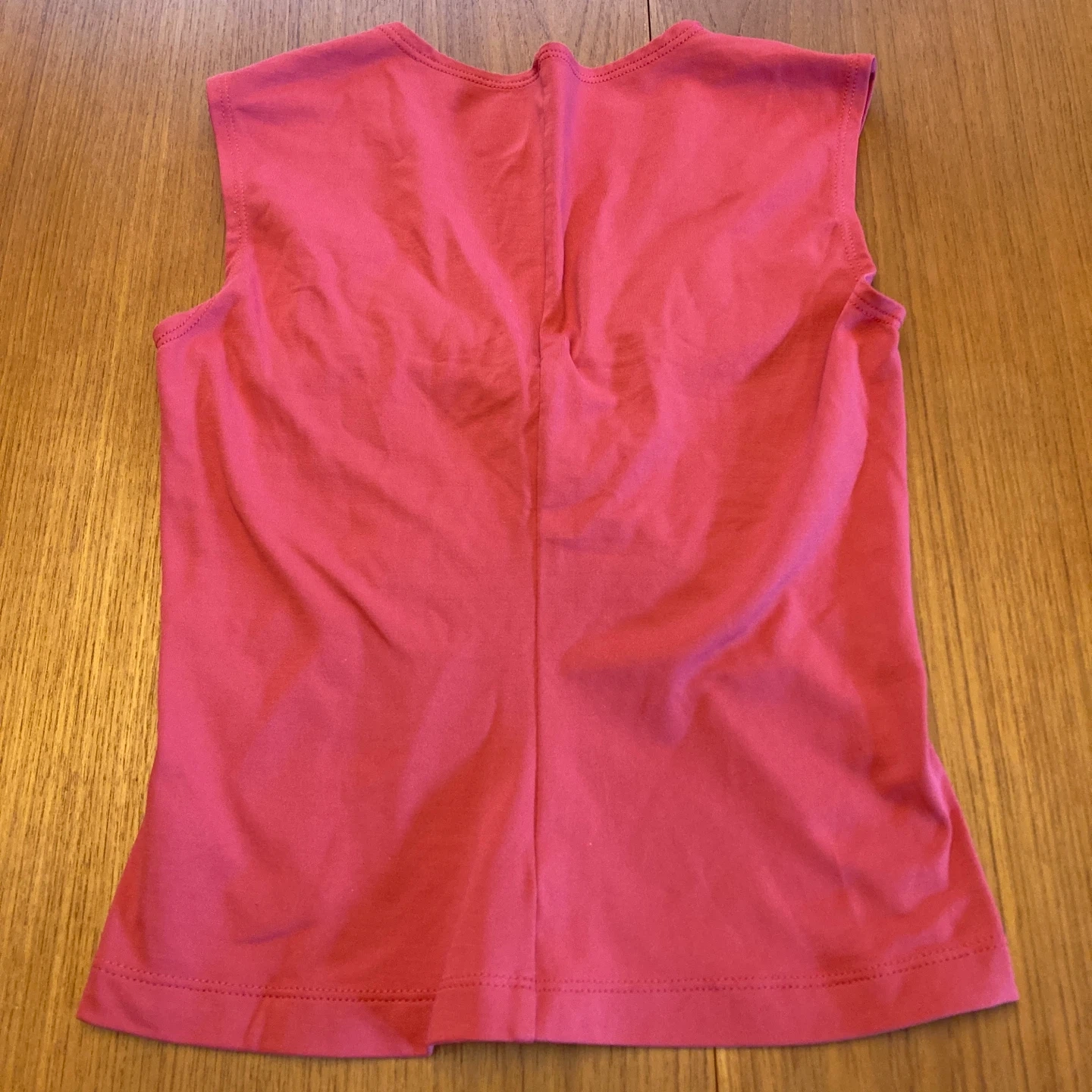 This is a coral pink sleeveless top from Patagonia. It's made with a blend of 92% nylon and 8% spandex. The front features a stylish twist detail. It's a size small.