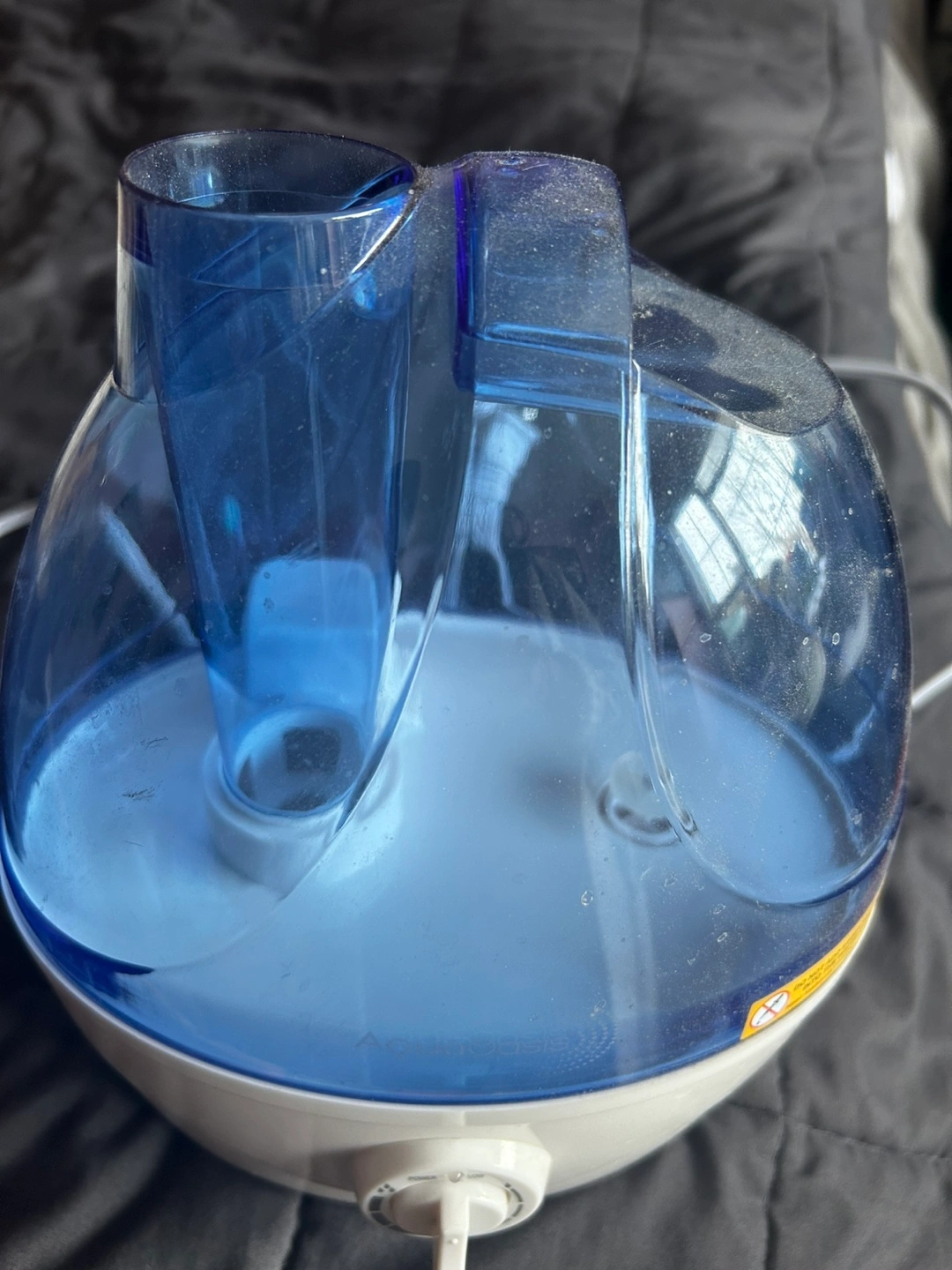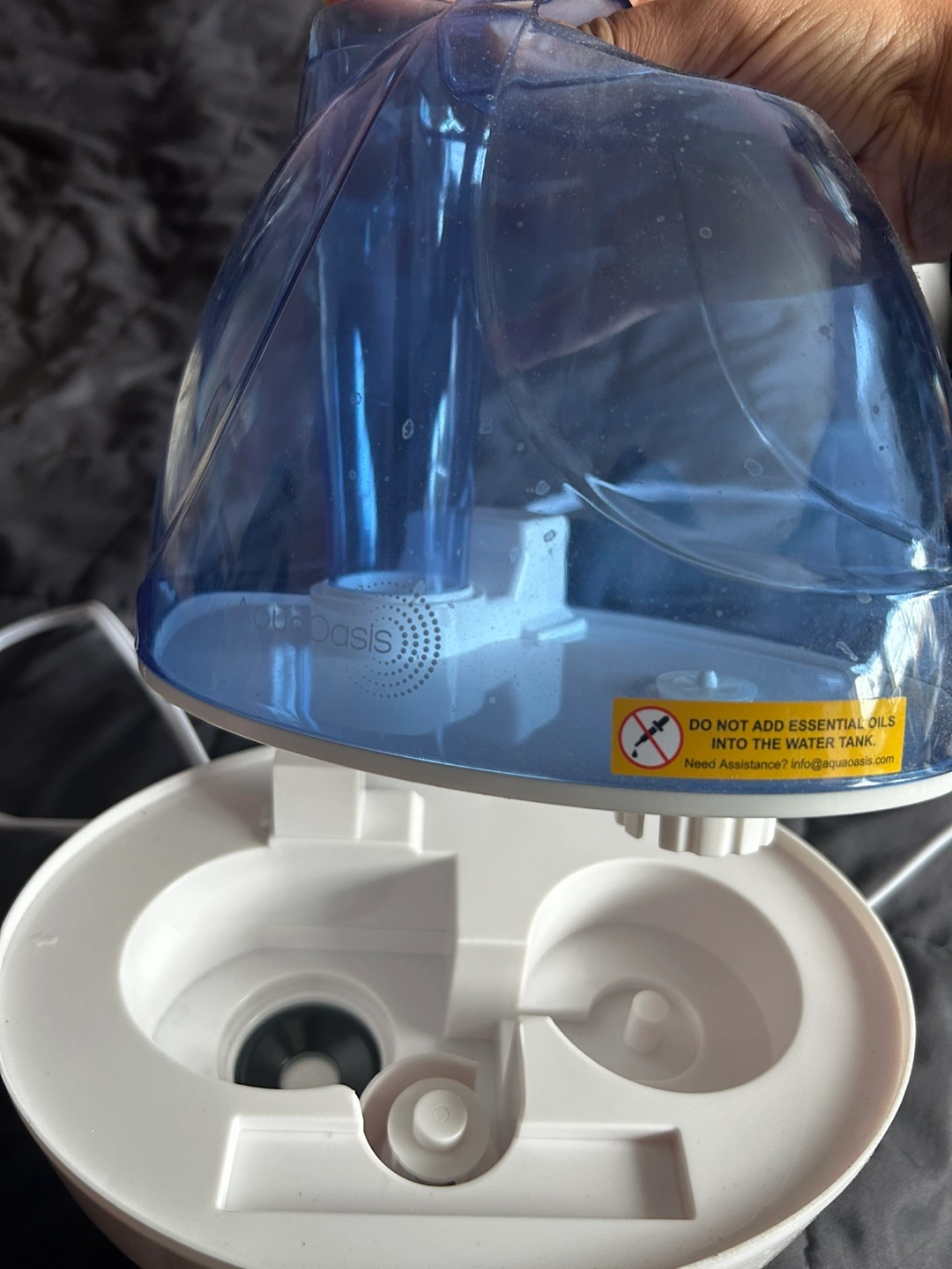 Brand new never used. This is an Aqua Oasis humidifier with a blue and white design. It's suitable for maintaining comfortable humidity levels in your home. Do not add essential oils to the water tank. Originally ordered on Amazon I think.