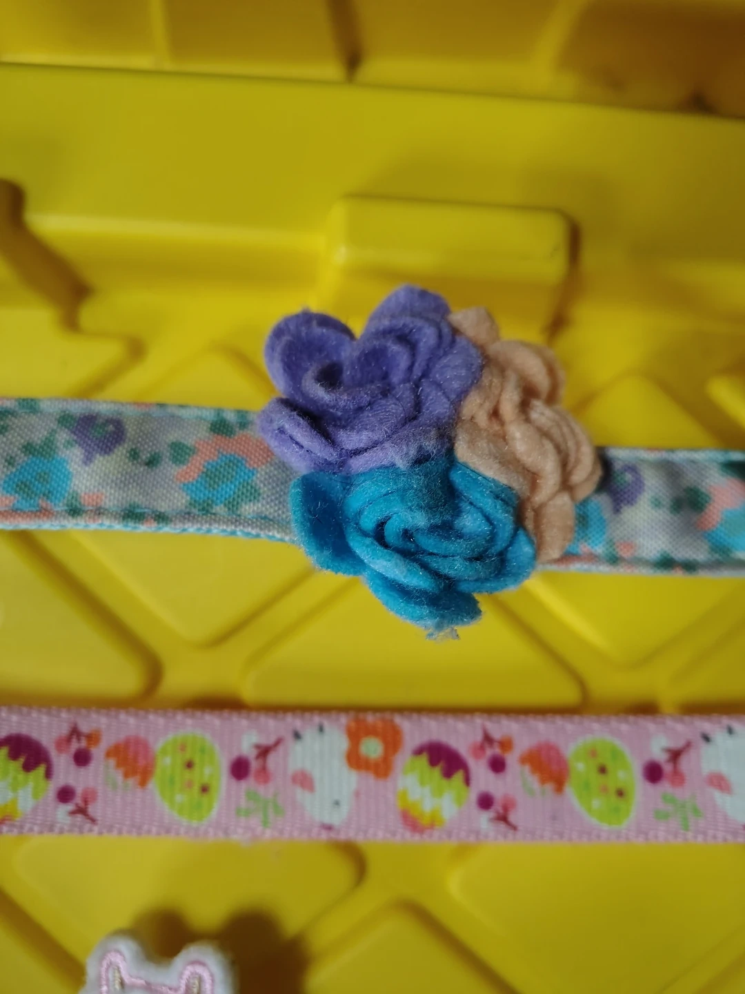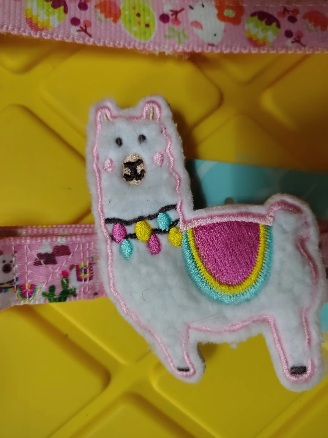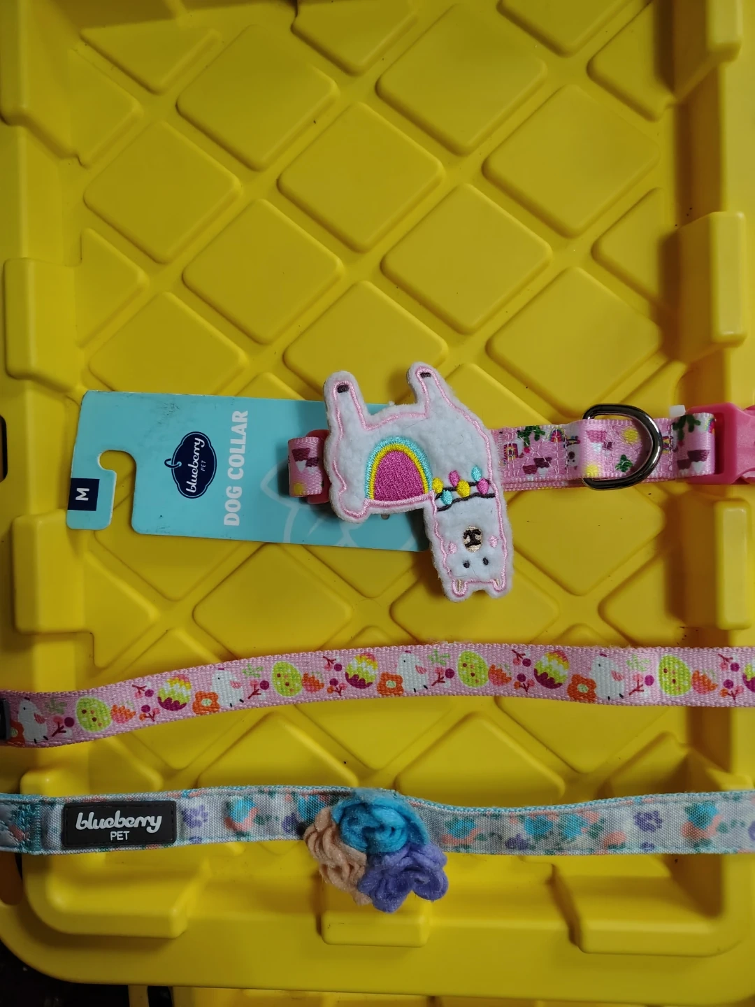 Set of three Blueberry Pet dog collars. Includes one size M collar with a llama design and a pink buckle, one collar with a pink and fruit pattern, and one collar with a floral pattern and a flower embellishment. These collars are adjustable and feature colorful designs.