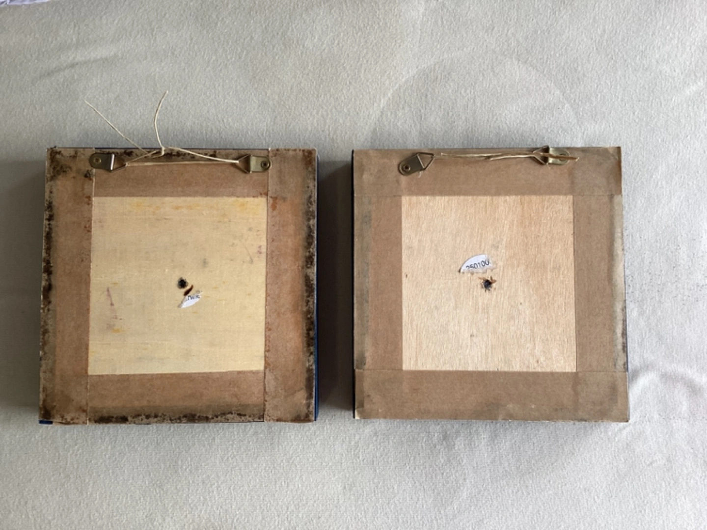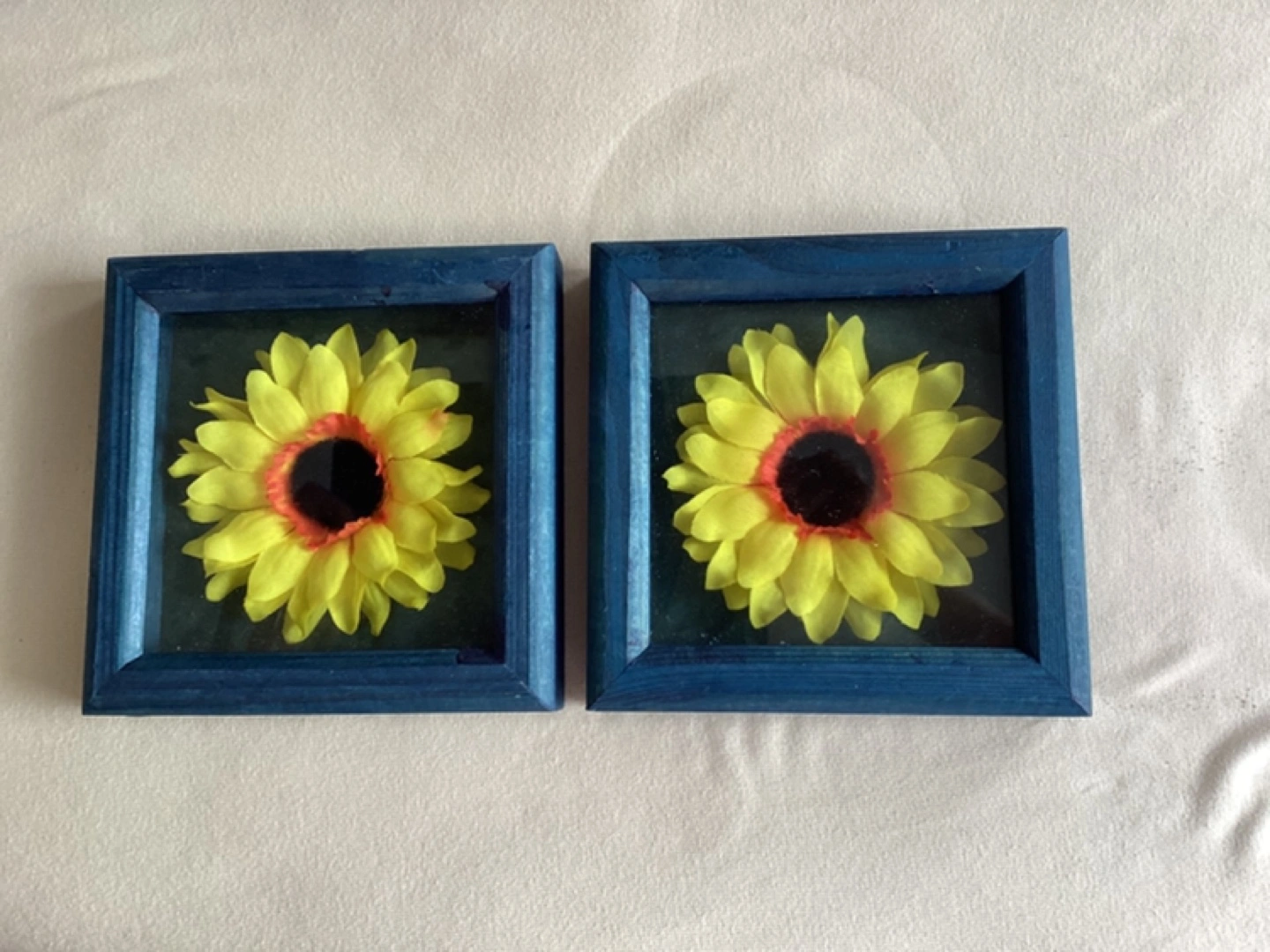 Pair of framed sunflower artwork, approximate size 5 1/4” X 5 1/4”, dark blue wooden frames, perfect for adding a touch of nature to your home decor, $5 or best offer.