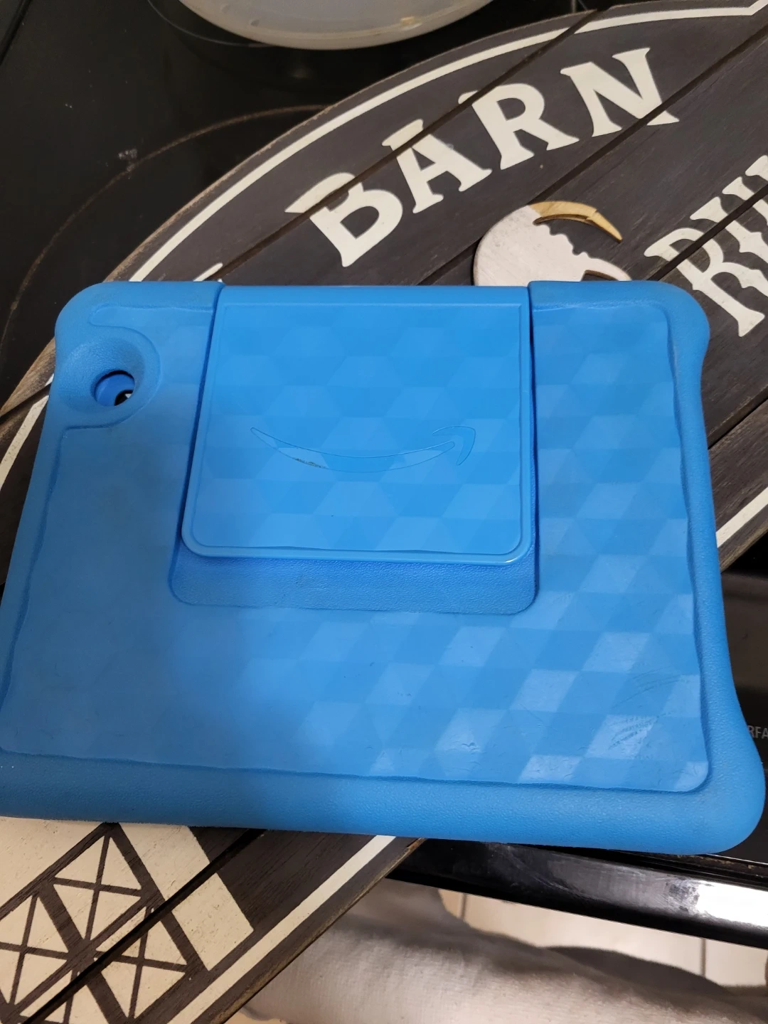This is a blue protective case for an Amazon Fire HD Kids Edition tablet. It's made of durable, kid-friendly material and includes a built-in stand. Offers great protection for your child's tablet!