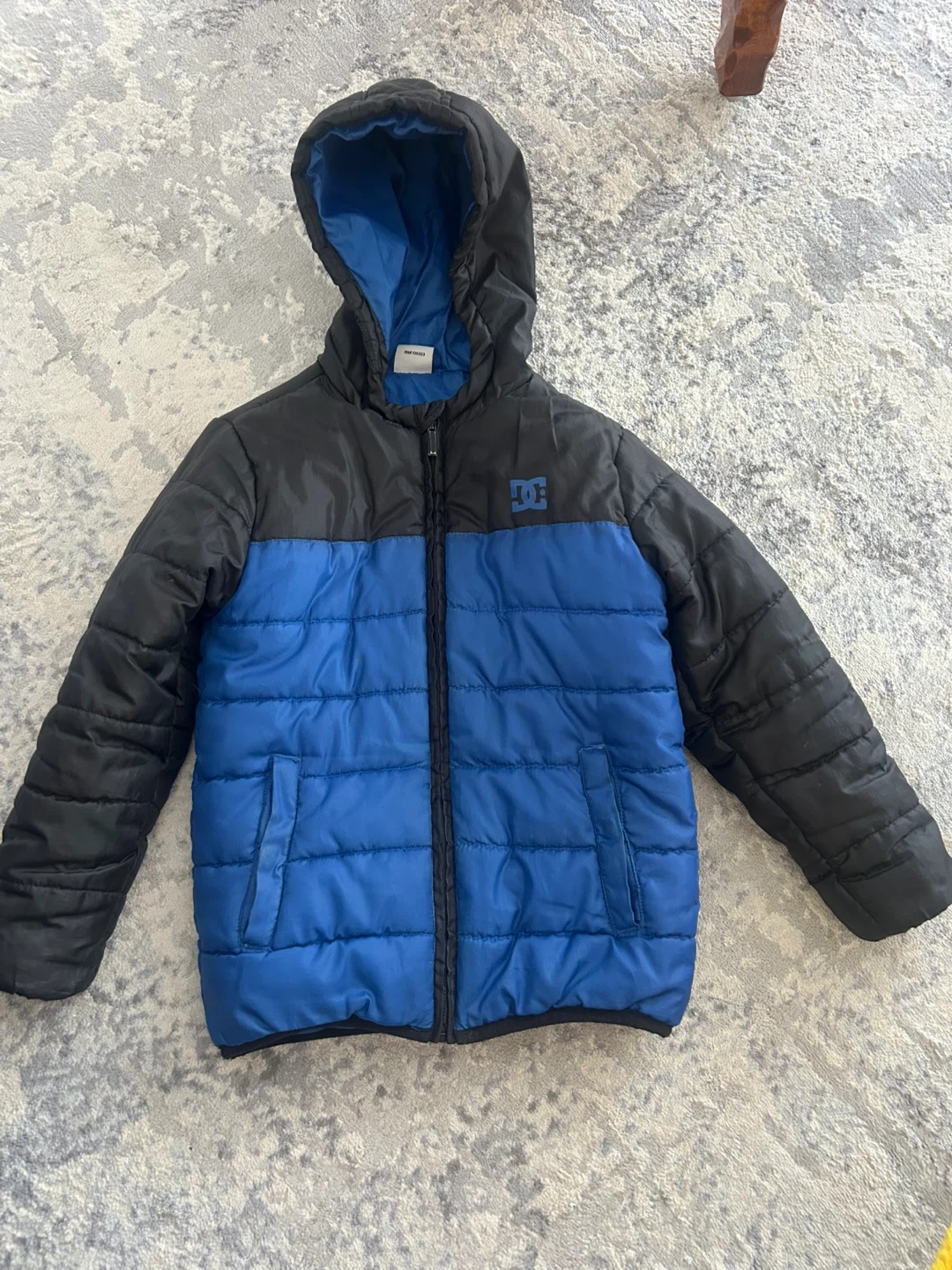 Blue and black puffer jacket with hood from DC Shoes. Features zippered pockets and a comfortable fit. Ideal for staying warm during rainy spring weather