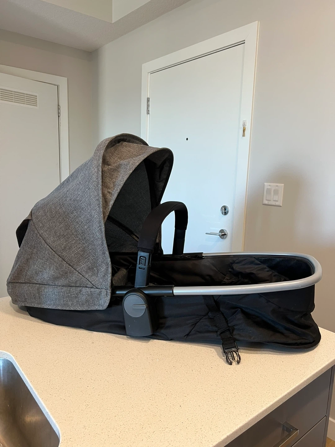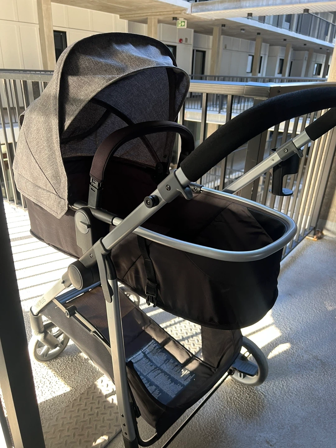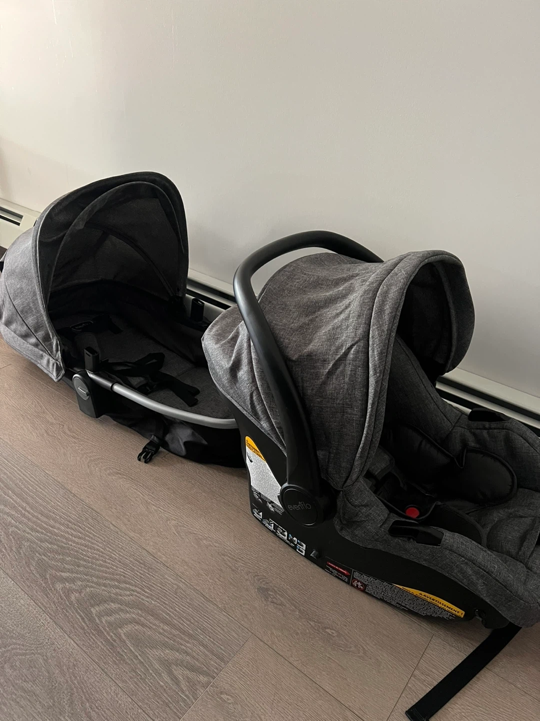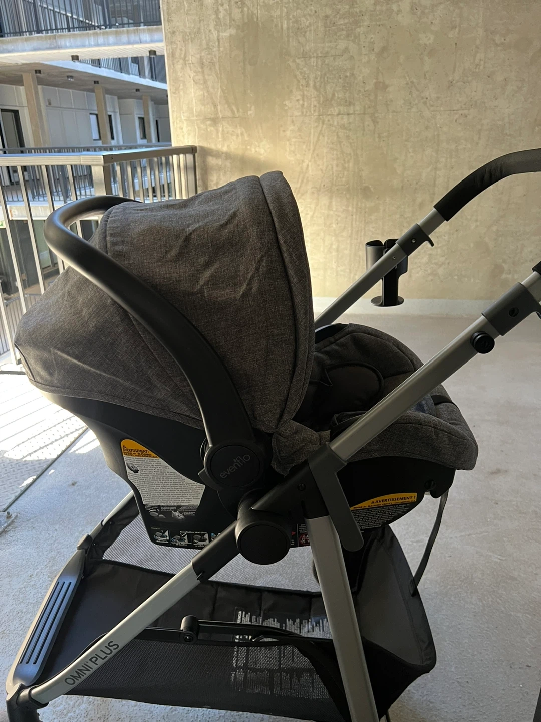 This Evenflo Omni Plus travel system includes a stroller and a LiteMax infant car seat. It's designed for convenience with a car seat that clicks into the stroller. It's a great setup for getting around with a baby!