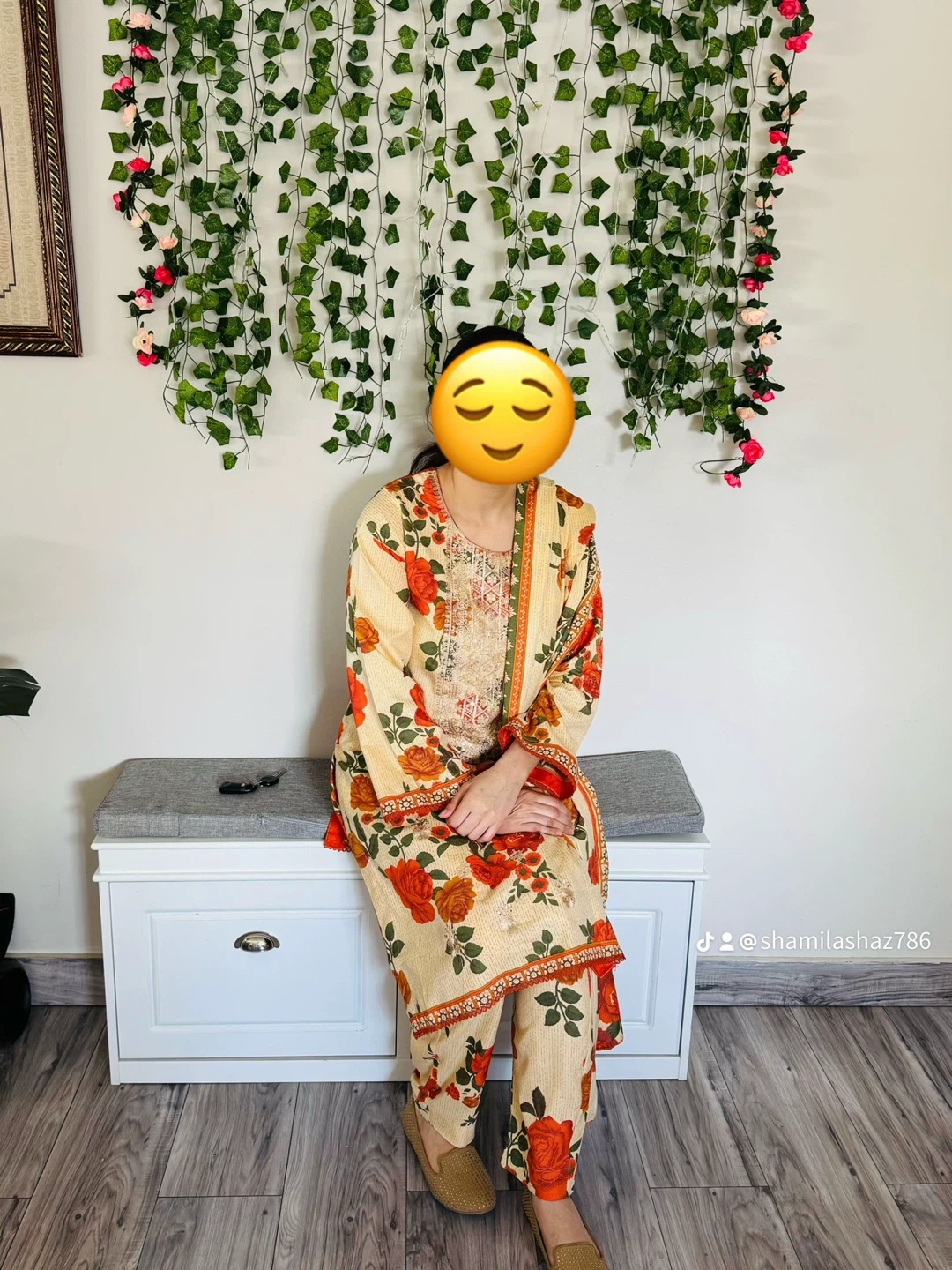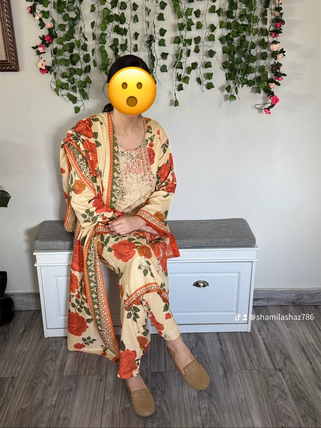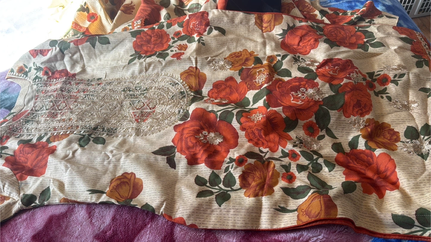 This cream-coloured outfit features a vibrant floral print with orange and green accents. It includes a kameez, trousers, and a dupatta. The fabric is lightweight and breathable, great martial