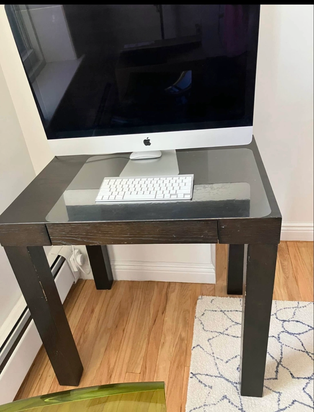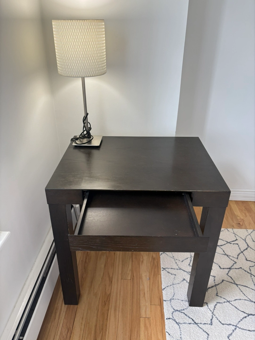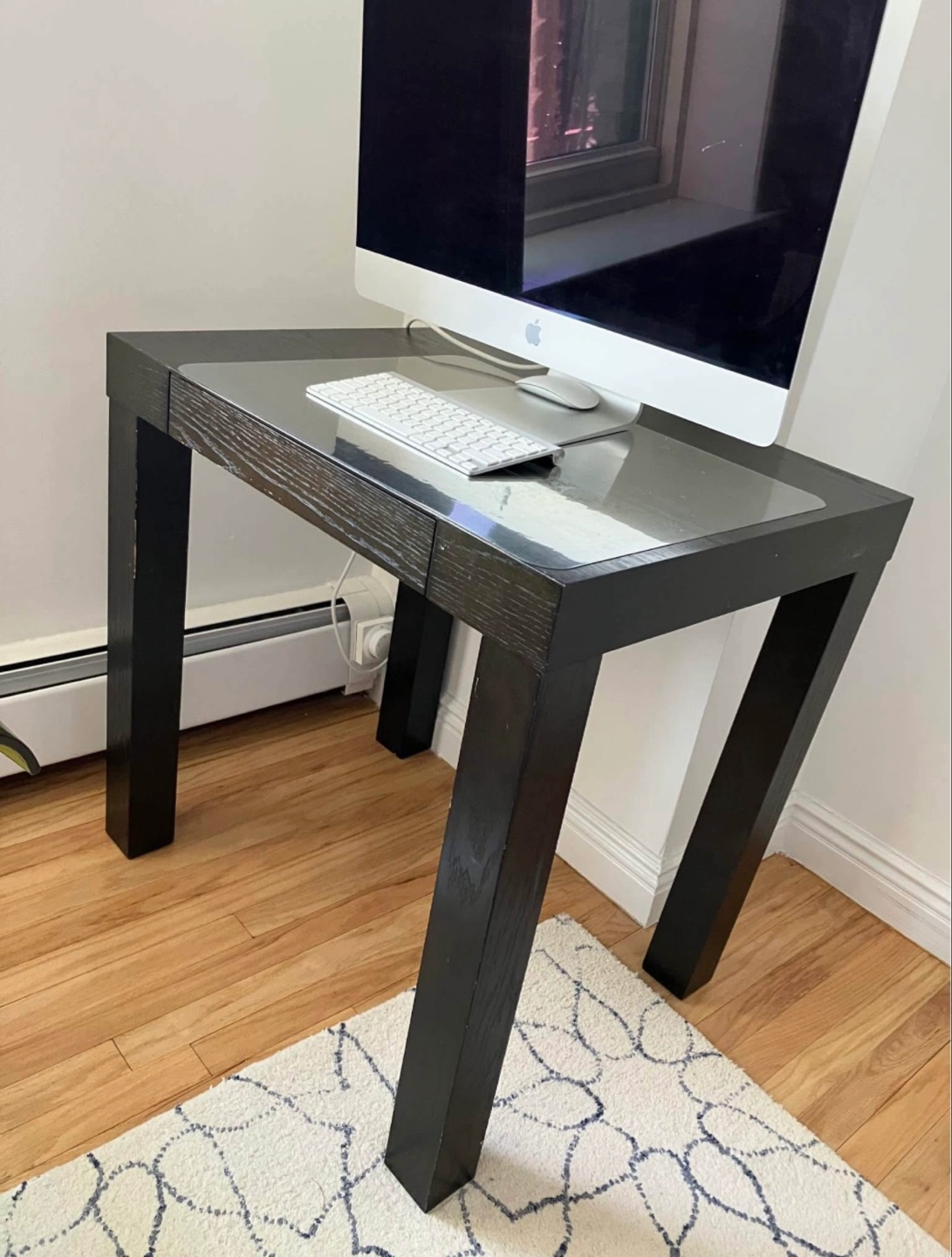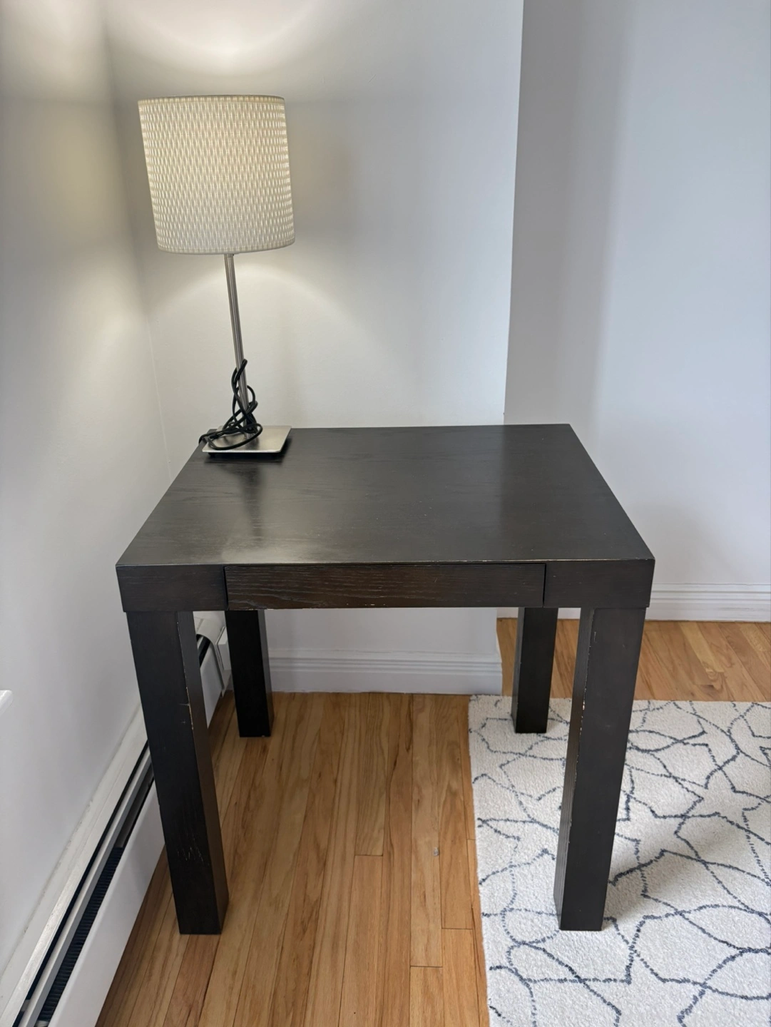 CB2 desk. Dark brown color. Featuring sturdy legs and a pull-out drawer. Suitable for a home office.m or study room.