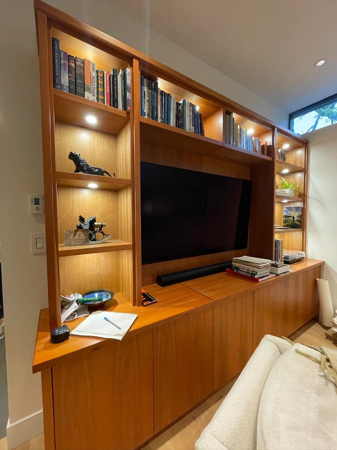 A beautiful, custom-built cherry wood entertainment unit and bookshelf system. It features ample shelving, cabinets below, and integrated lighting. Perfect for organizing media and displaying decor.
