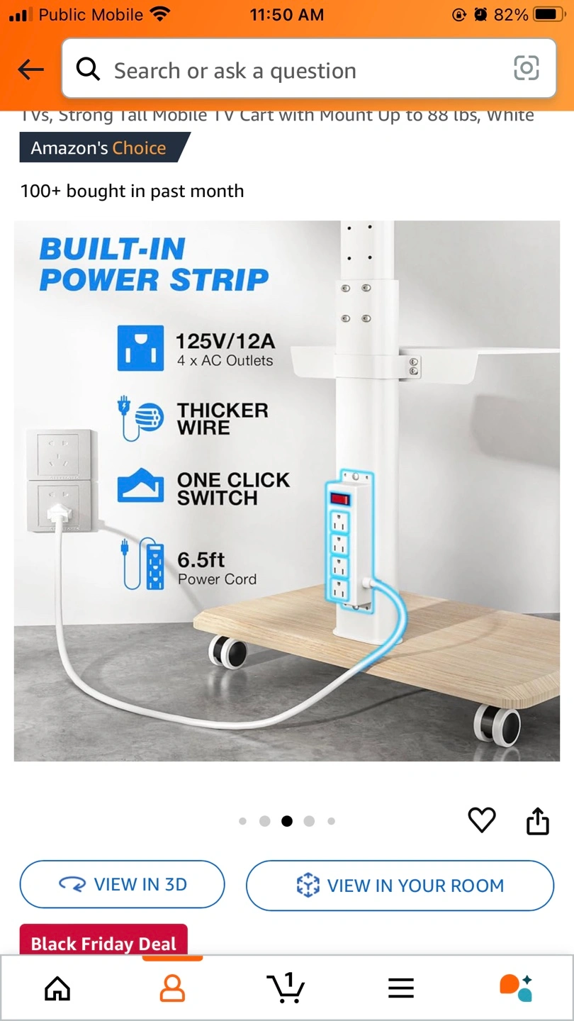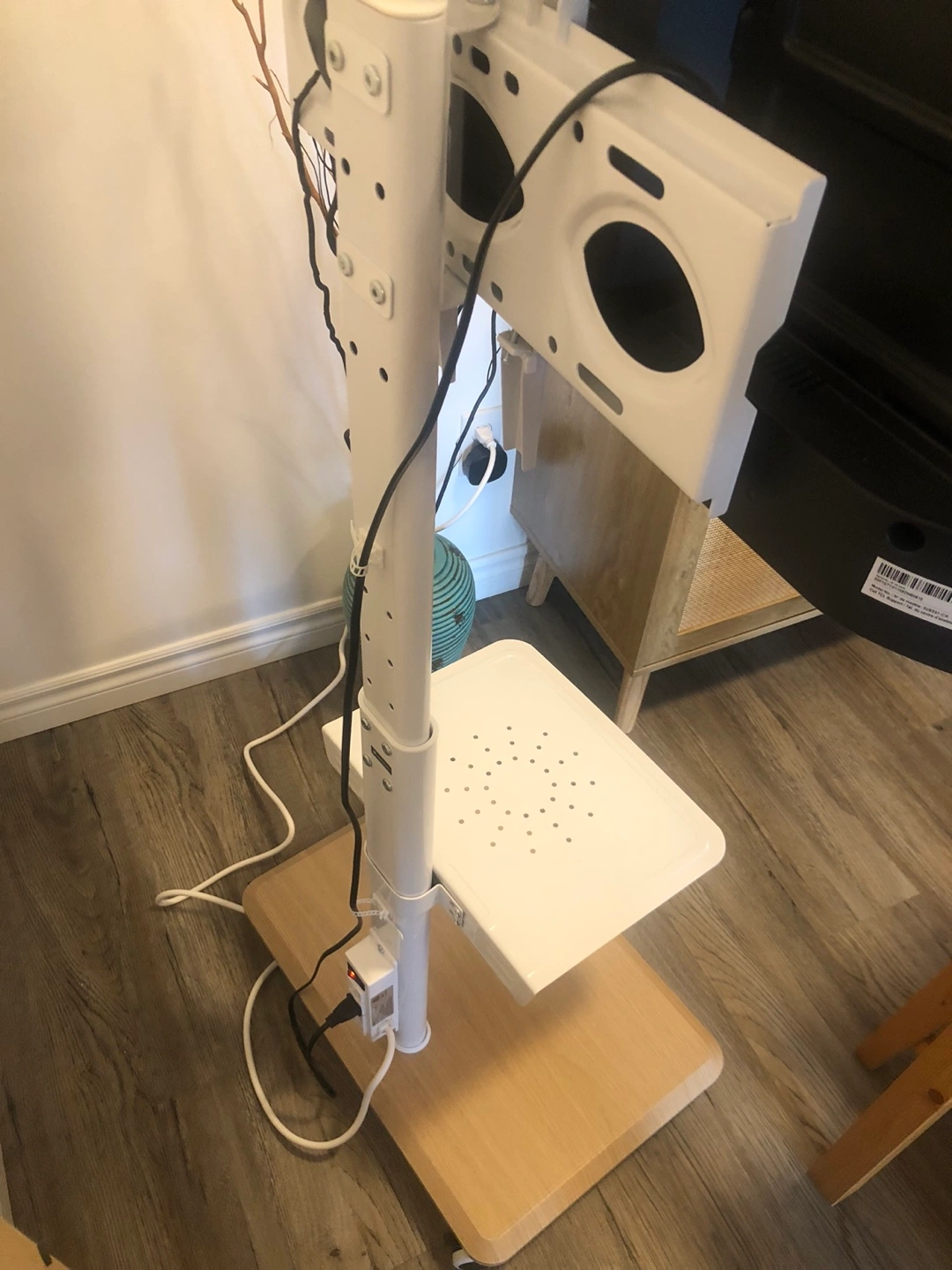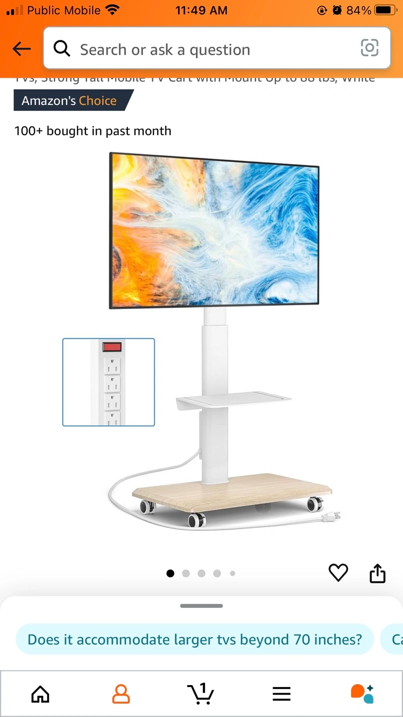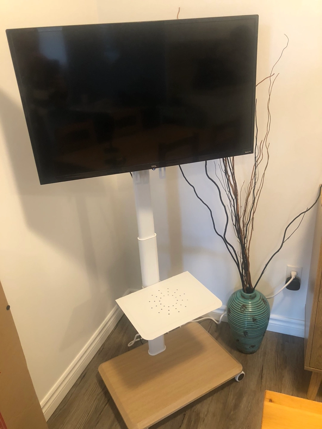 Strong tall mobile TV cart with mount up to 88 lbs, white, swivels 60 degrees, has eight levels of height adjustment, with a wooden base, and a power bar. Easily move around to enjoy your favorite TV shows anywhere. Fits 32”-70” televisions.