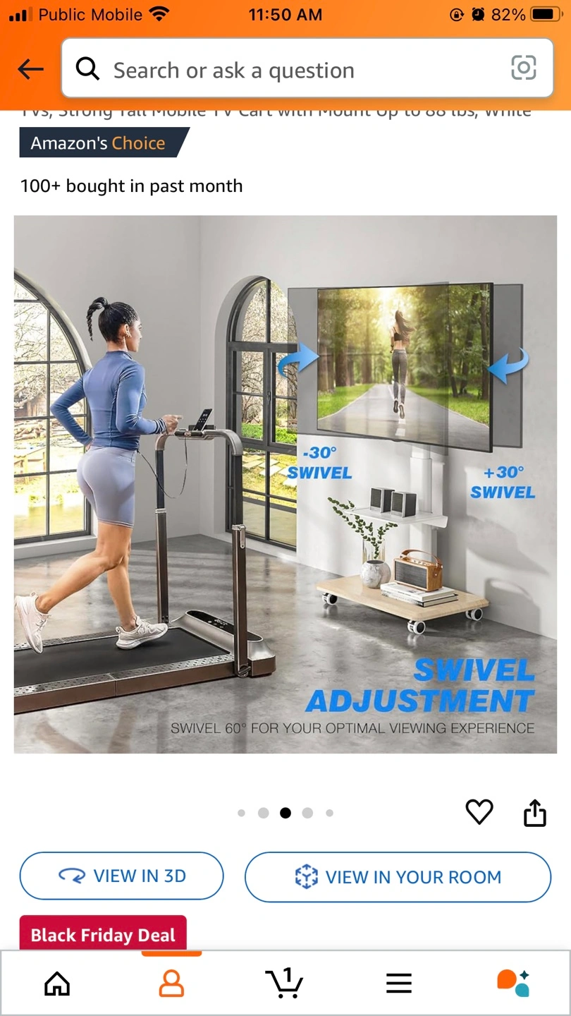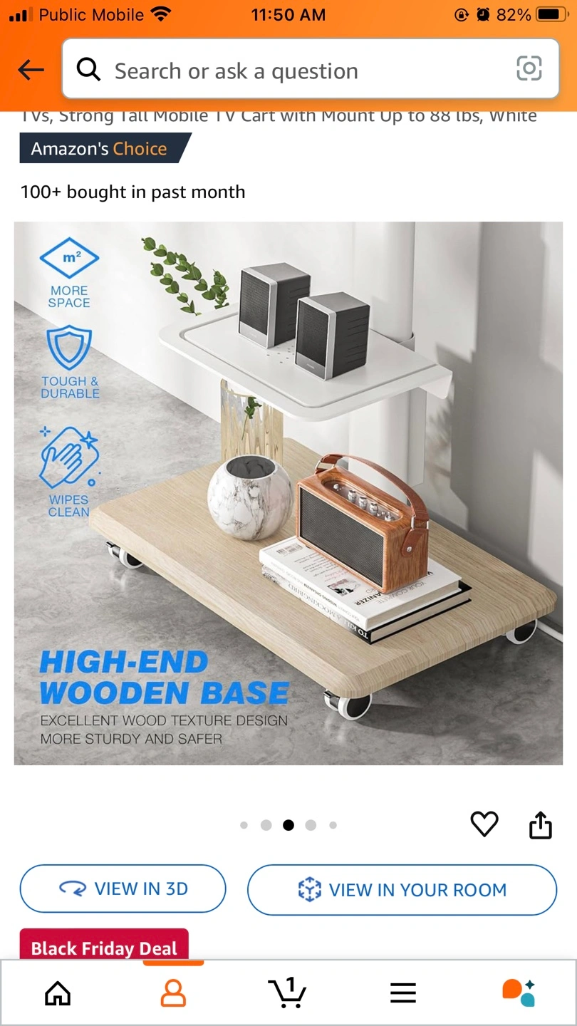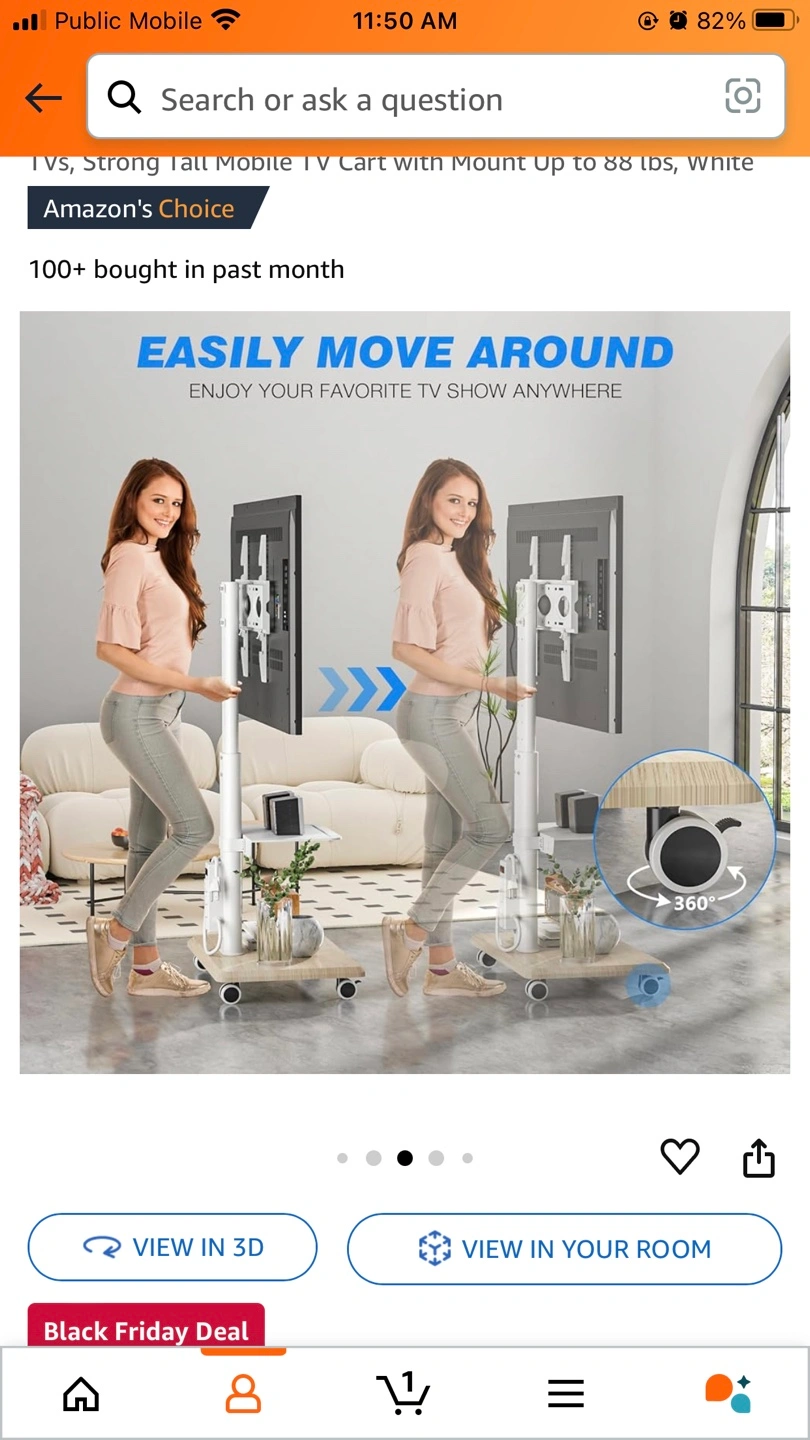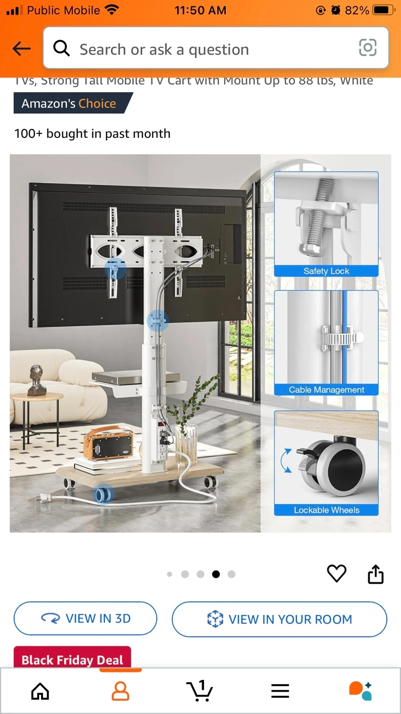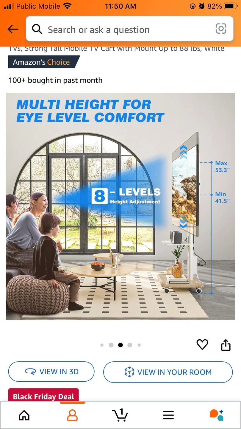 Strong tall mobile TV cart with mount up to 88 lbs, white, swivels 60 degrees, has eight levels of height adjustment, with a wooden base, and a power bar. Easily move around to enjoy your favorite TV shows anywhere. Fits 32”-70” televisions.