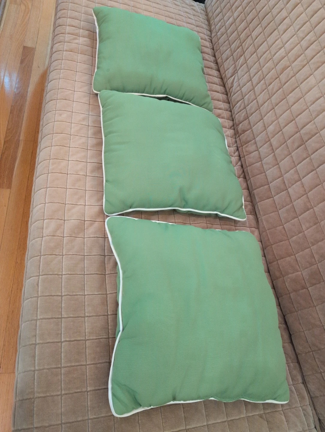 Selling a set of three green throw pillows. They're in great shape and would look lovely on a couch or bed. The pillows have a nice, soft texture and a clean, simple design with white trim.