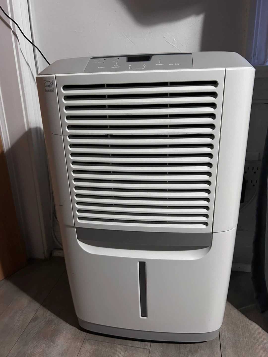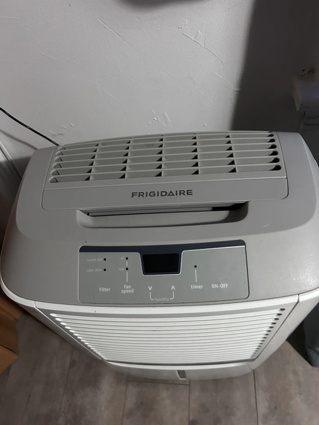 This is a Frigidaire dehumidifier. It has multiple fan speeds and a timer function. The unit includes a water bucket for collection.