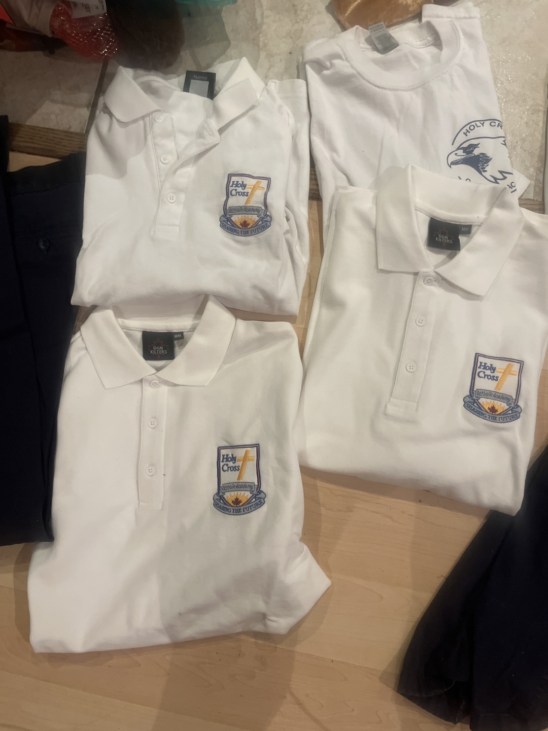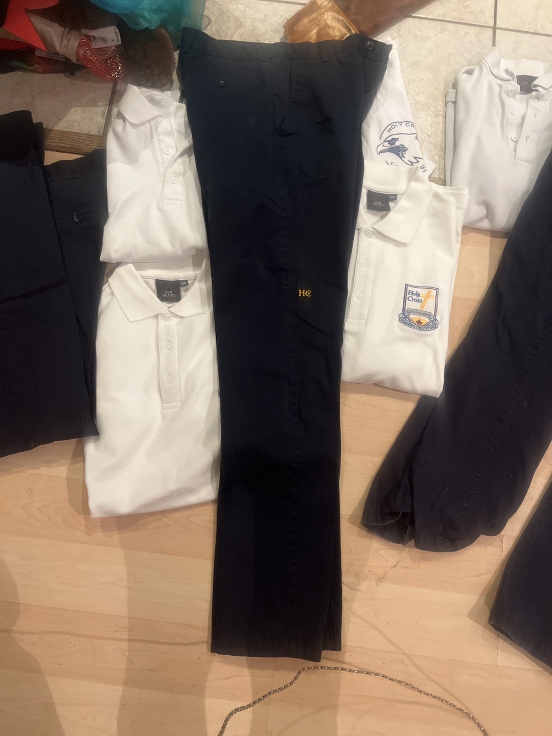 Selling a set of Holy Cross school uniform items. Includes pants and polo shirts. Great for back to school!
