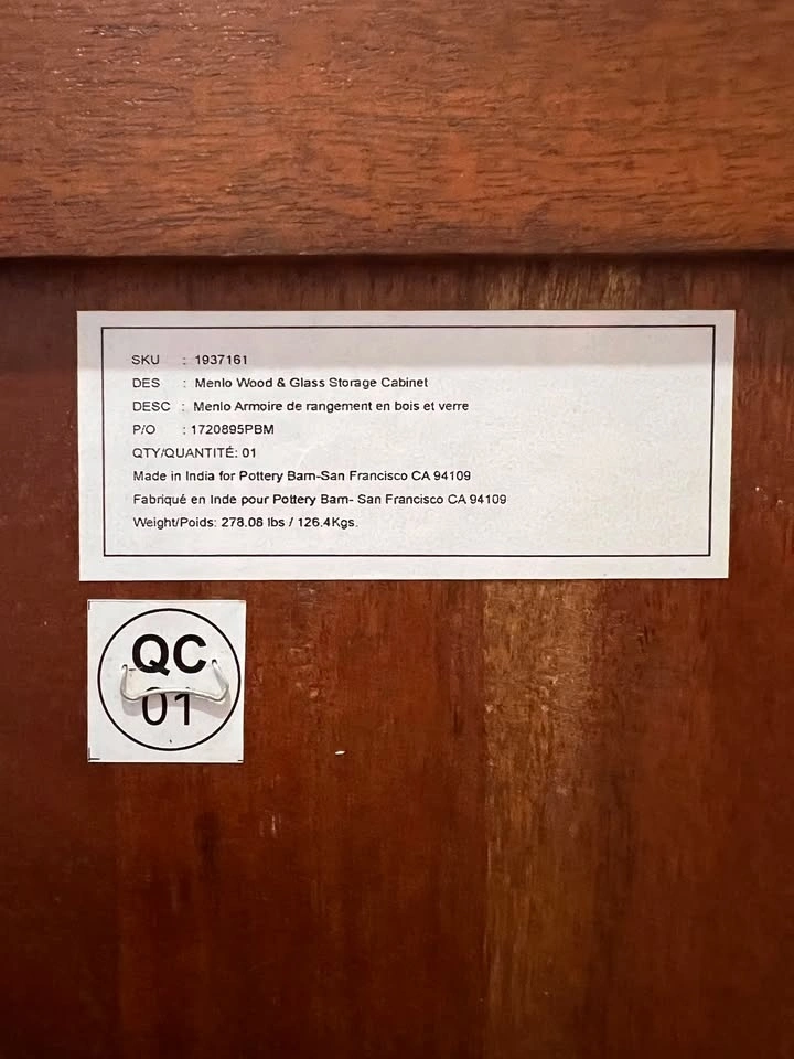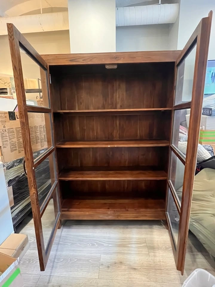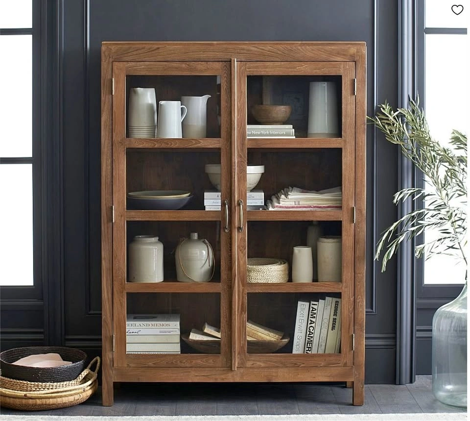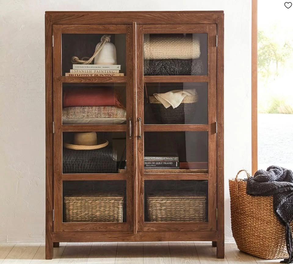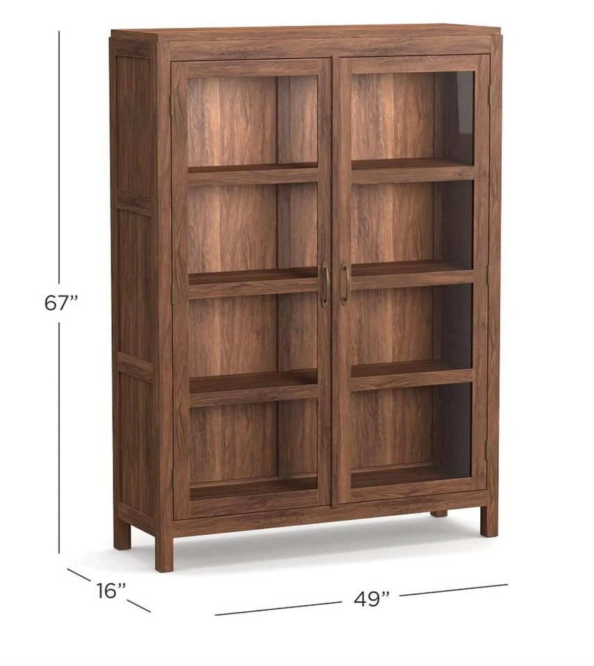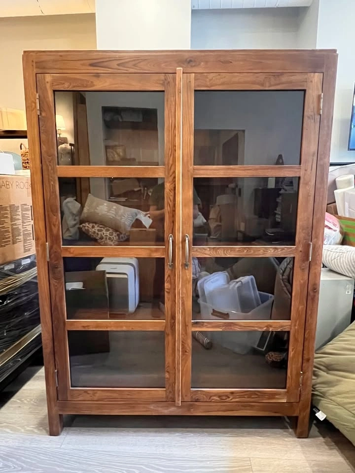 Crafted from sustainably harvested, kiln-dried reclaimed solid teak and acacia woods. Features clear tempered glass paneled swing-out doors. Adjustable levelers add stability. Anti-tip kit included.