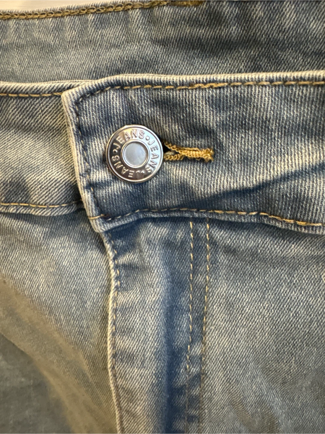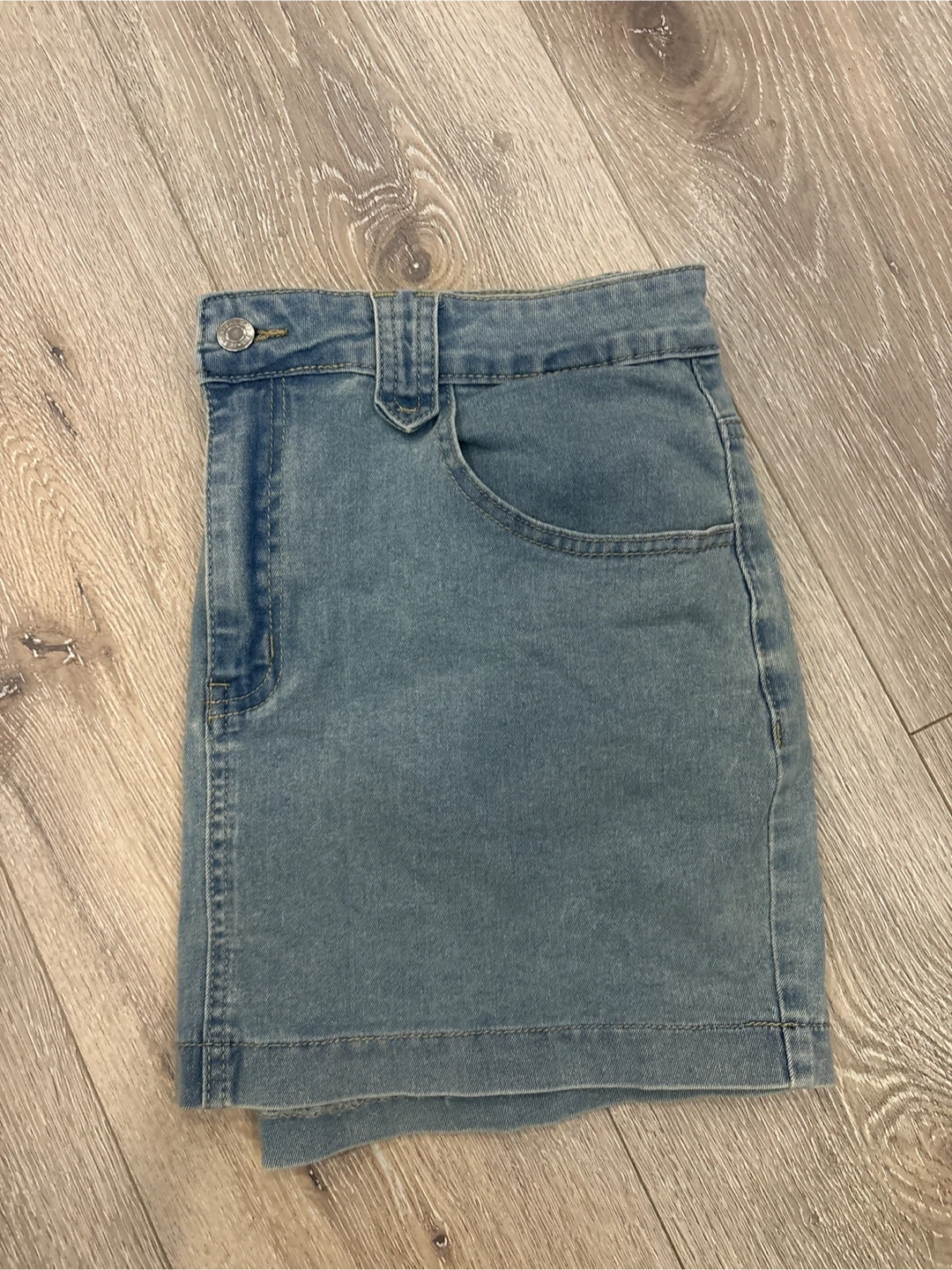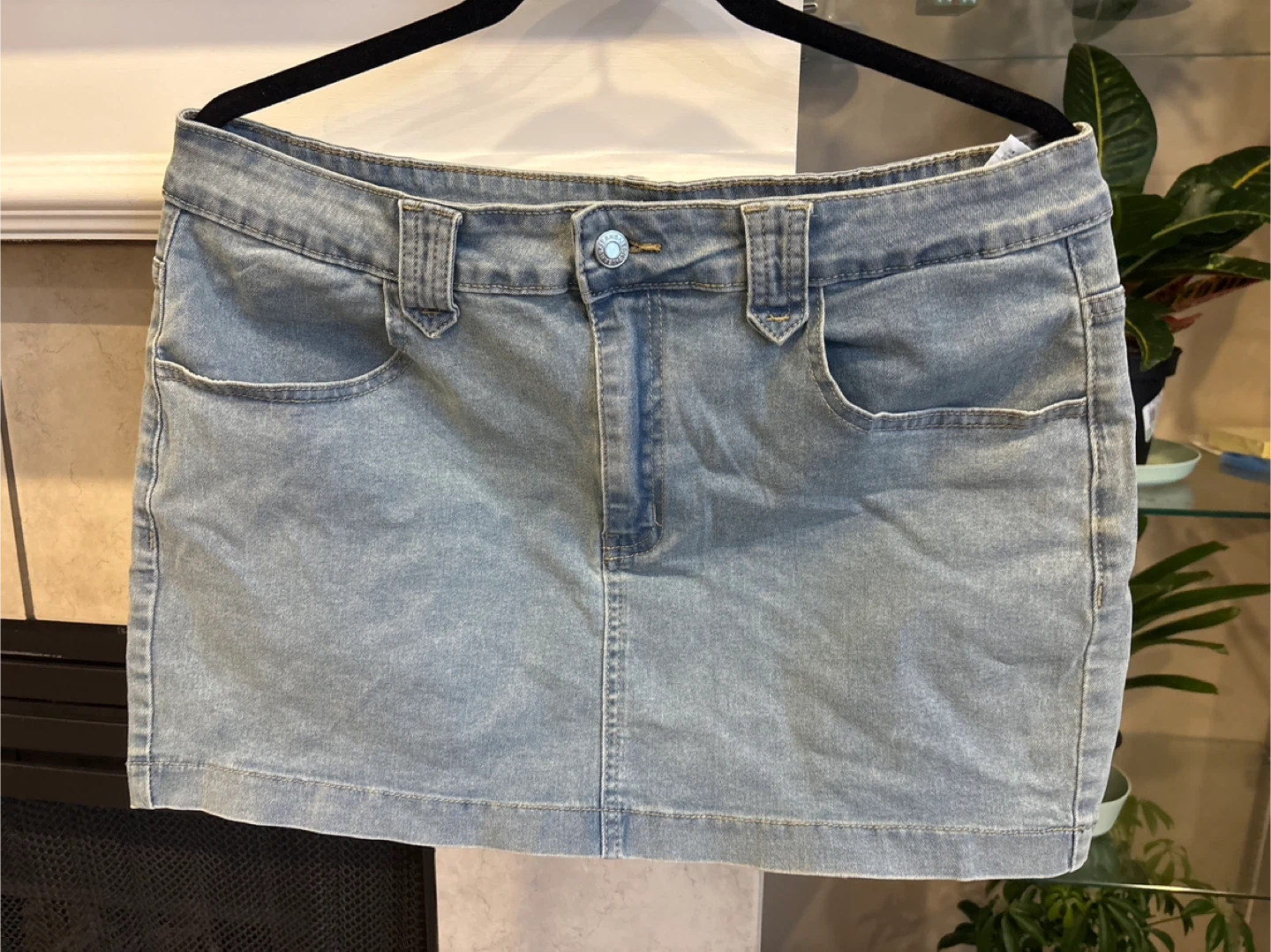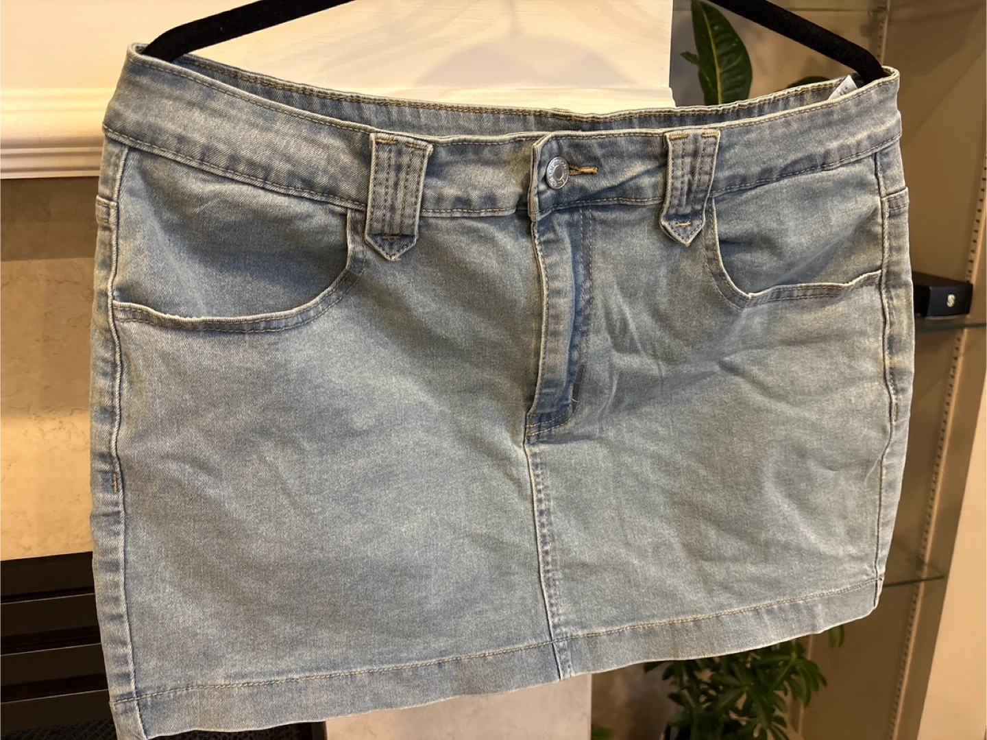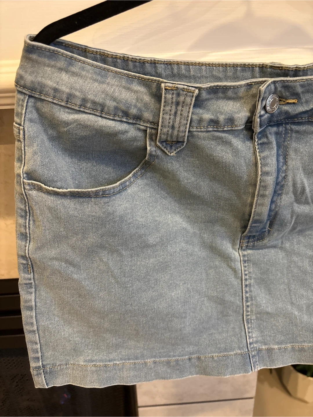 A casual light wash denim mini skirt. It has a classic five-pocket design. This skirt is made of cotton for a comfortable fit. Size 1 XL