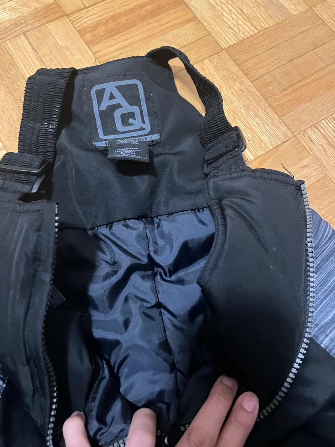 a pair of snow pants from AQ Explore the Unknown in size 3T. They're black with gray stripes on the sides. #cleanout