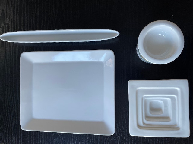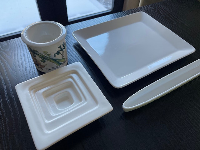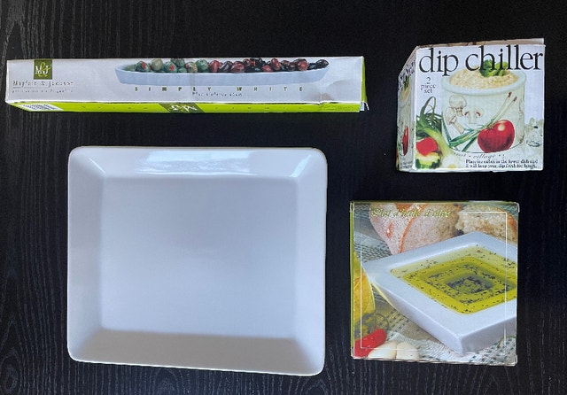 Everything you need for serving appetisers at your next dinner party! All four items are new and never used, most with original packaging. This set of four comes with: one large rectangular platter, one long skinny dish for olives, one deep plate for olive oil to dip bread, and one dip bowl with a base for ice to keep dip cool. Pickup at Davisville station.
