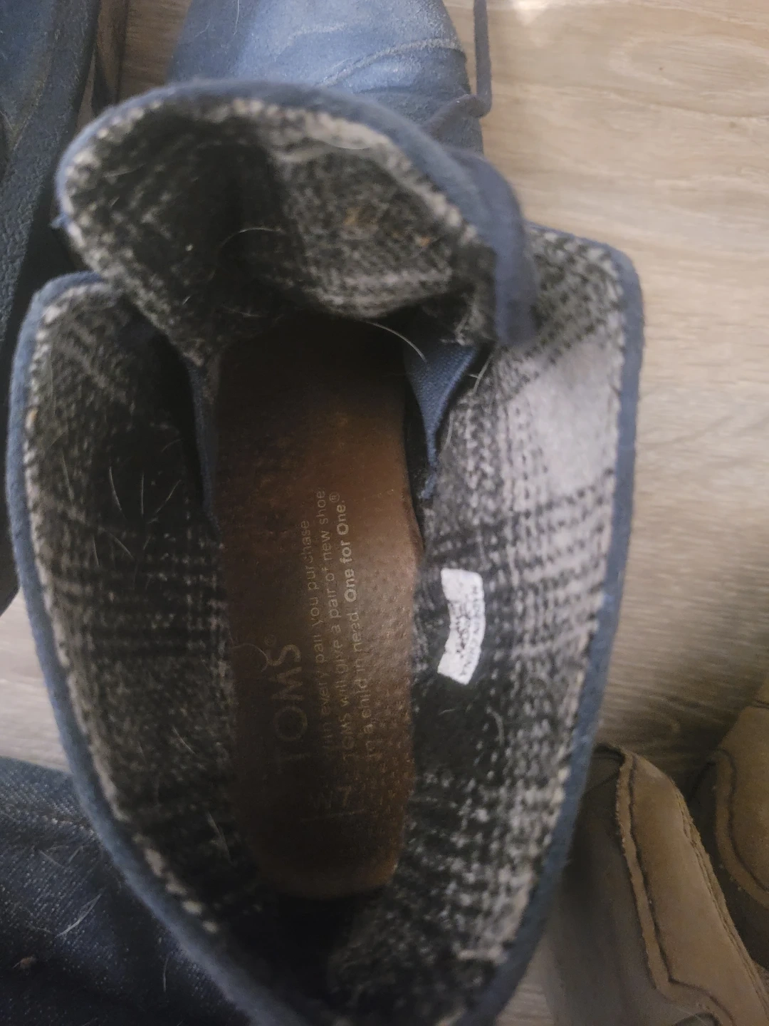 TOMS navy blue suede ankle boots. These shoes are a lace-up style with a comfortable lining. They're great for casual wear.