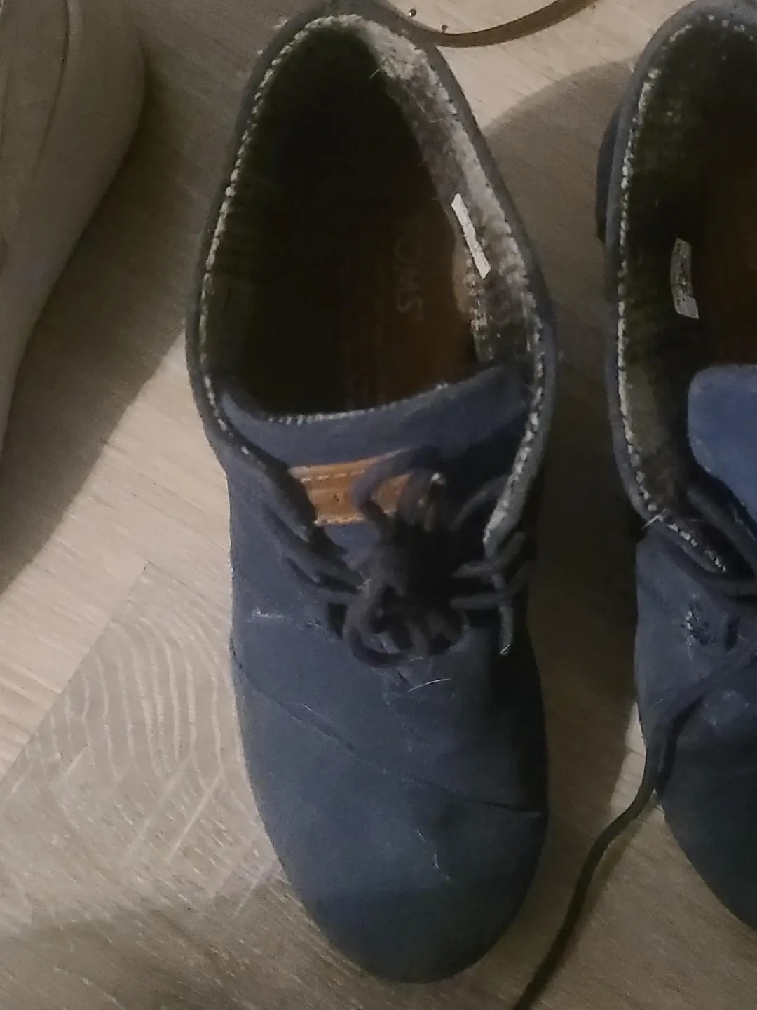 TOMS navy blue suede ankle boots. These shoes are a lace-up style with a comfortable lining. They're great for casual wear.
