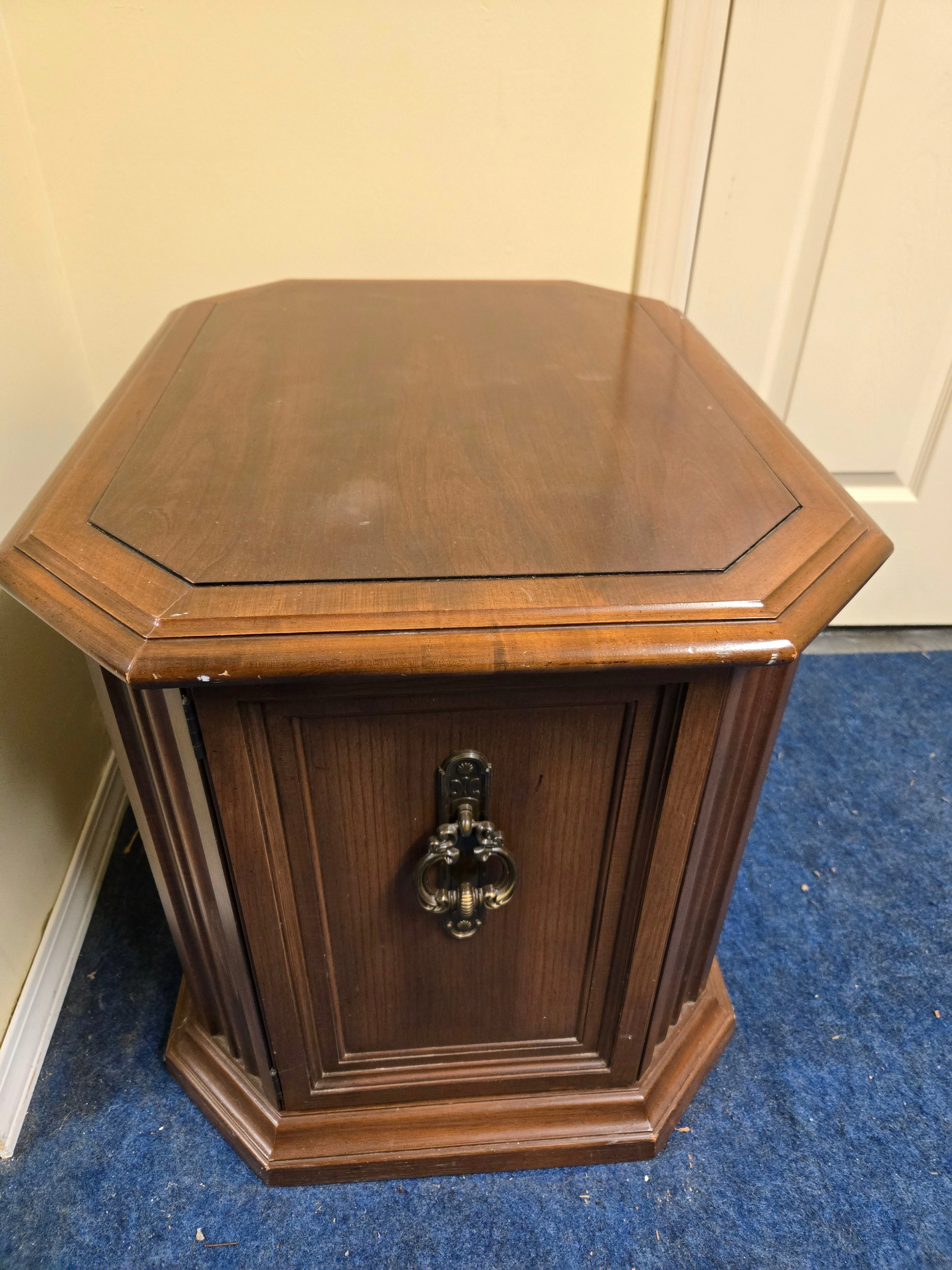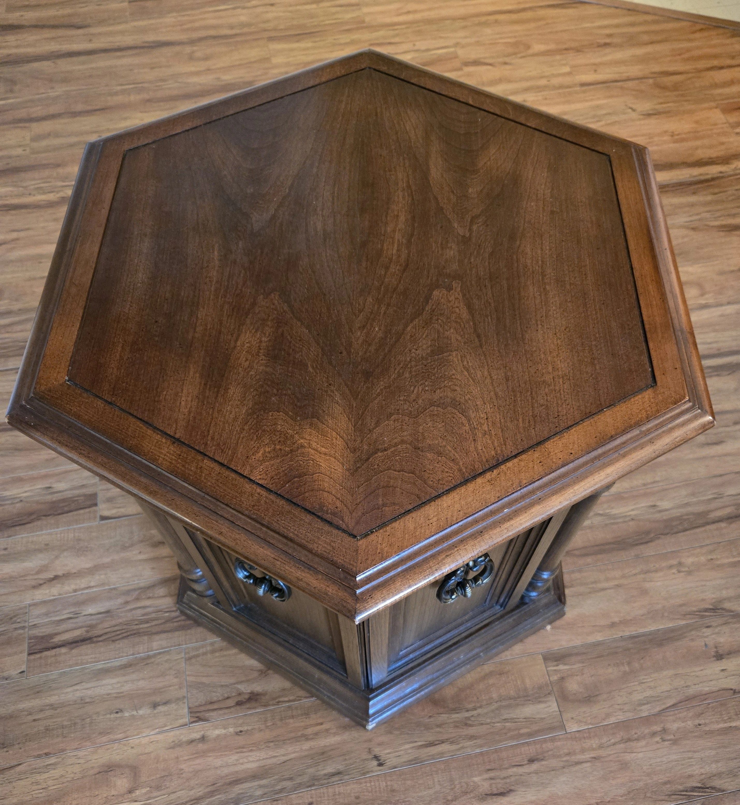 • 2 Hexagonal Storage End Tables: Featuring stunning cathedral-style recessed panels and original antiqued brass ring-pull hardware. The interior cabinets provide deep, functional storage.