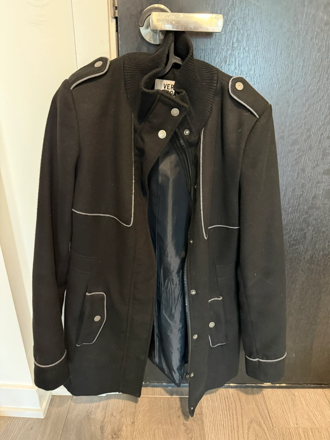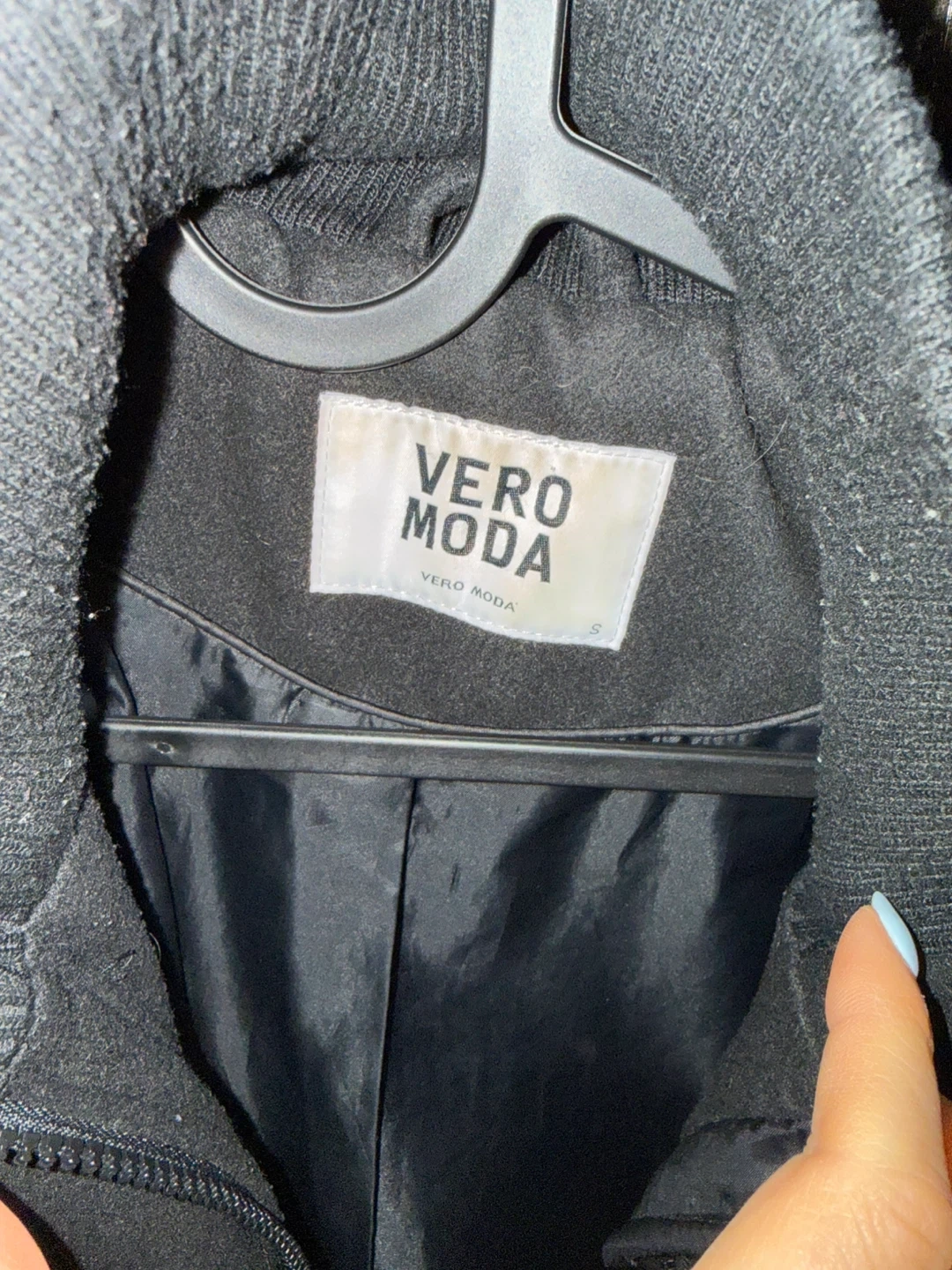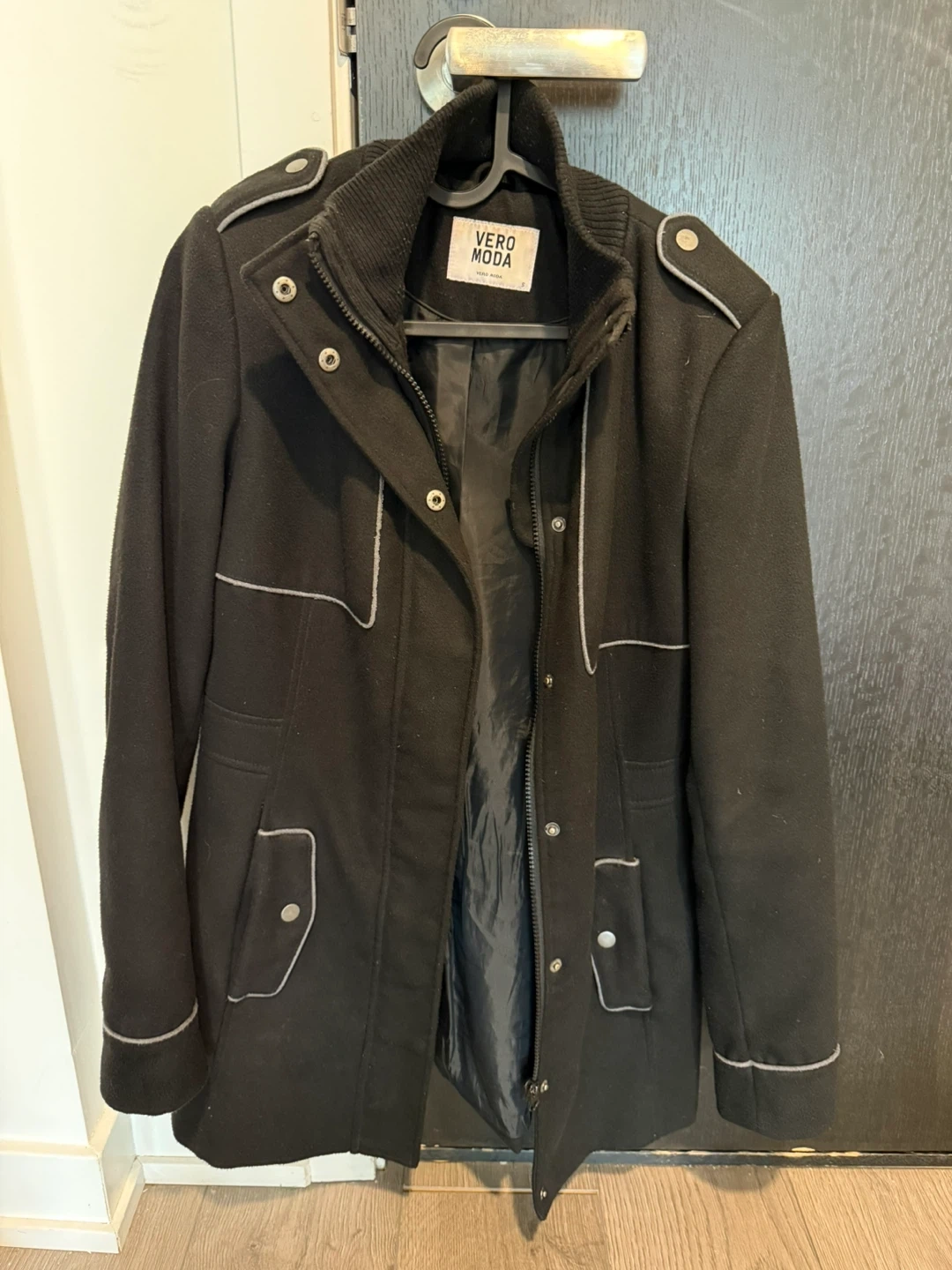 This is a black jacket from Vero Moda. It's a size small. The jacket is made of a wool-blend material. Perfect for spring!!! And fall