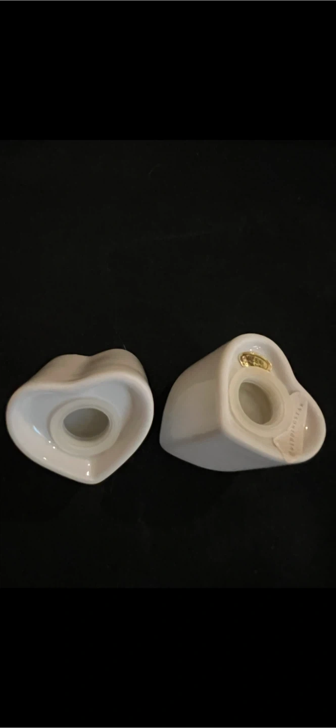 A set of two white ceramic heart-shaped salt and pepper shakers. These shakers are made of durable ceramic and have a smooth finish. They're perfect for adding a touch of charm to your dining table. Ceramic material.