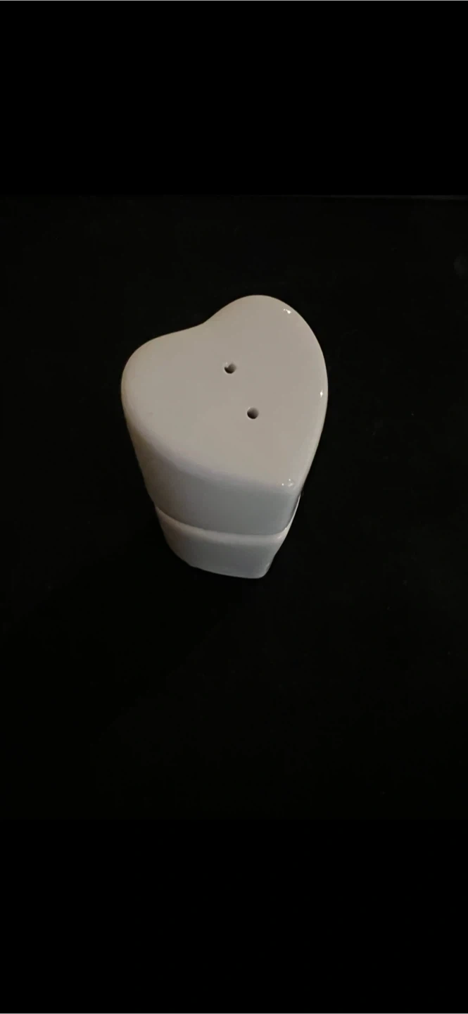 A set of two white ceramic heart-shaped salt and pepper shakers. These shakers are made of durable ceramic and have a smooth finish. They're perfect for adding a touch of charm to your dining table. Ceramic material.