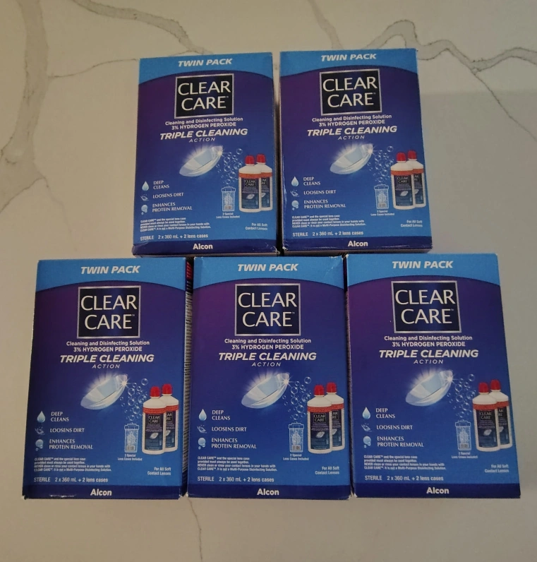 Clear care cleaning solution and lens case 2 pack. Expires in August and September but perfect if you're just about to run out. Brand new in sealed boxes. $5 each or $20 for all 5 boxes.