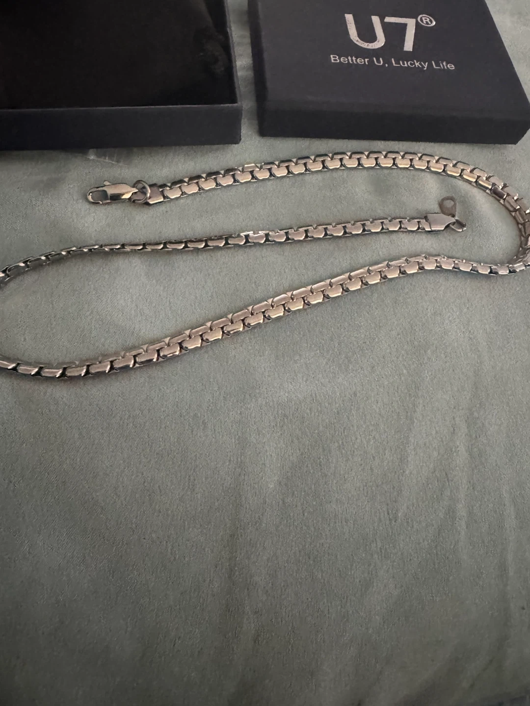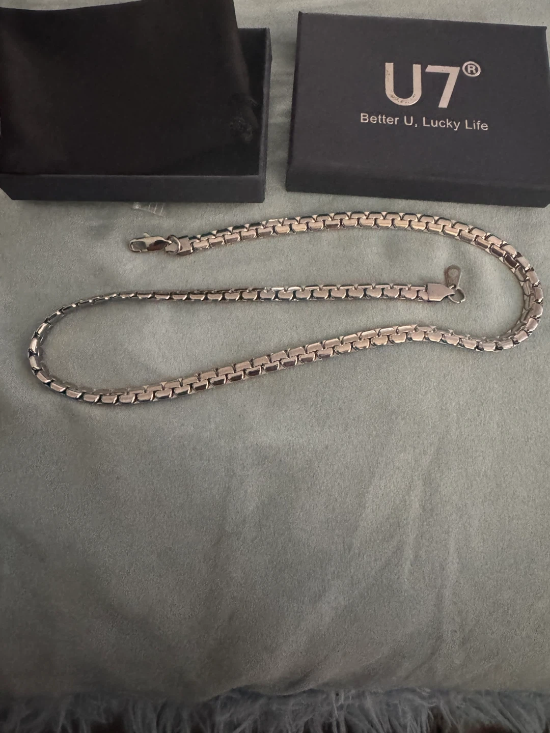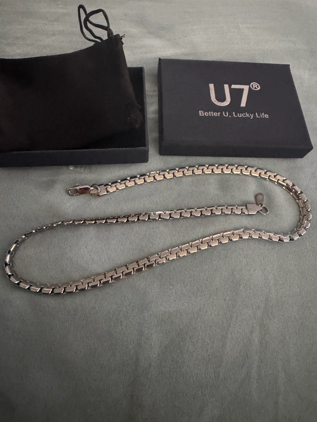This is a U7 brand silver tone chain necklace. It comes with its original box and a drawstring pouch. The chain has a durable lobster clasp closure.