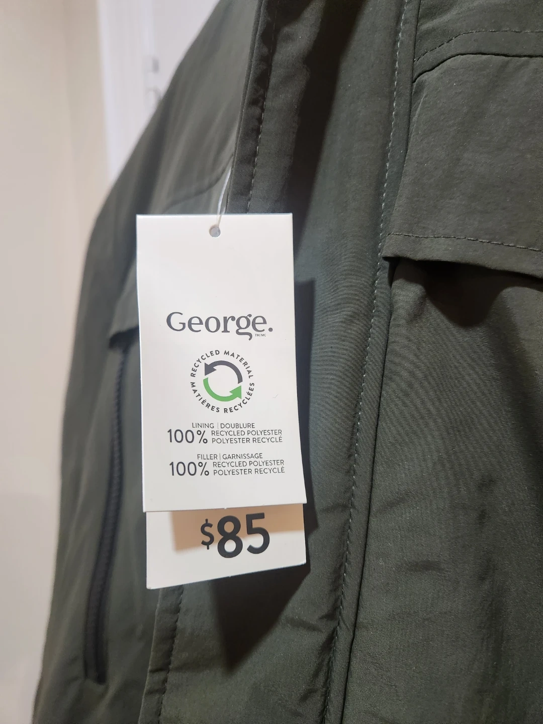 This green George parka jacket is made with 100% recycled polyester for the lining and fill. It's a warm and durable outerwear option.