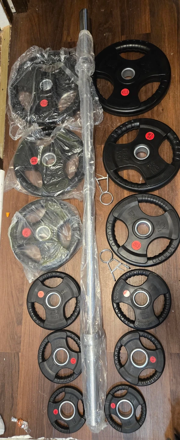 This set includes a barbell and a variety of weight plates. Plate weights visible are 45lb, 25lb, 10lb, and 5lb. Includes two spring collars for securing weights. Great for home gym workouts!