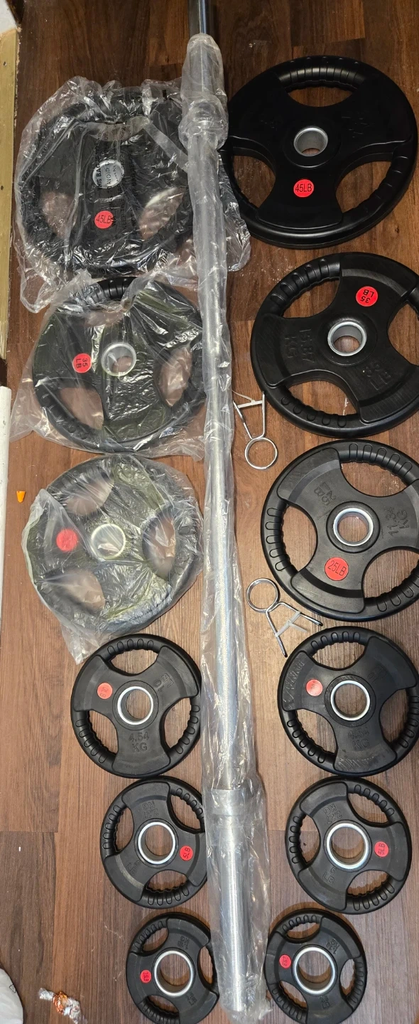 This set includes a barbell and a variety of weight plates. Plate weights visible are 45lb, 25lb, 10lb, and 5lb. Includes two spring collars for securing weights. Great for home gym workouts!