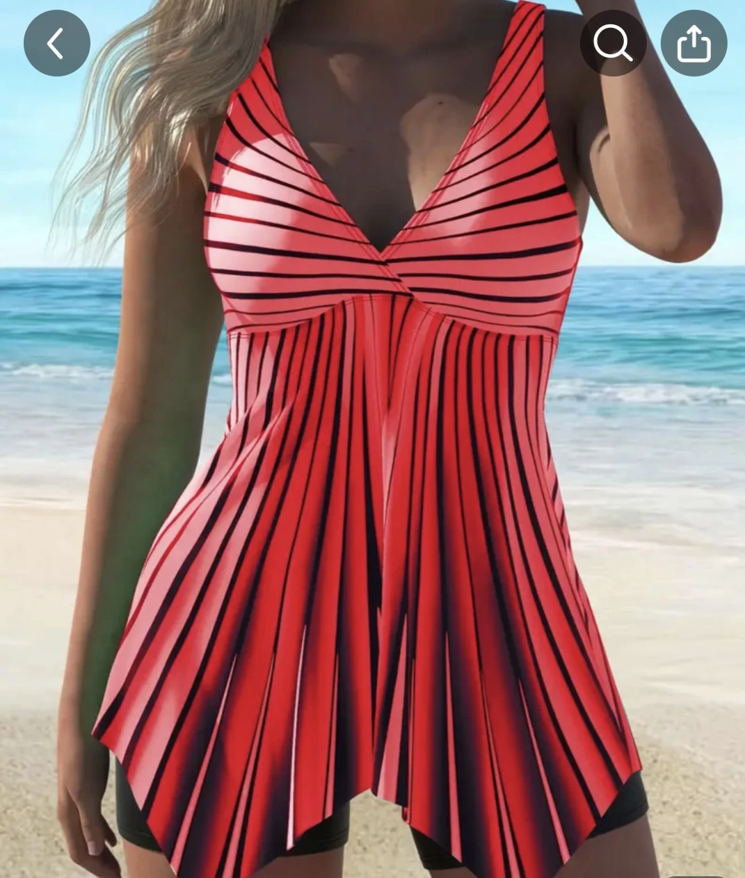 This is a red and black striped swim top and shorts. It features a V-neckline and adjustable straps. The fabric is a blend for comfortable wear.