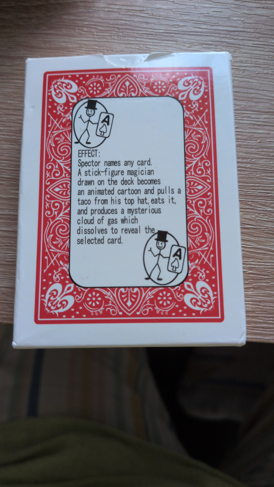 Spector names any card. A stick-figure magician drawn on the deck becomes an animated cartoon and pulls a taco from his top hat, eats it, and produces a mysterious cloud of gas which dissolves to reveal the selected card