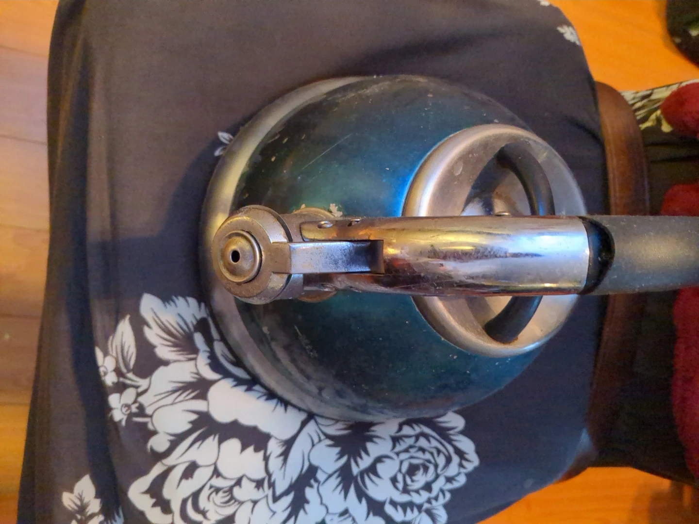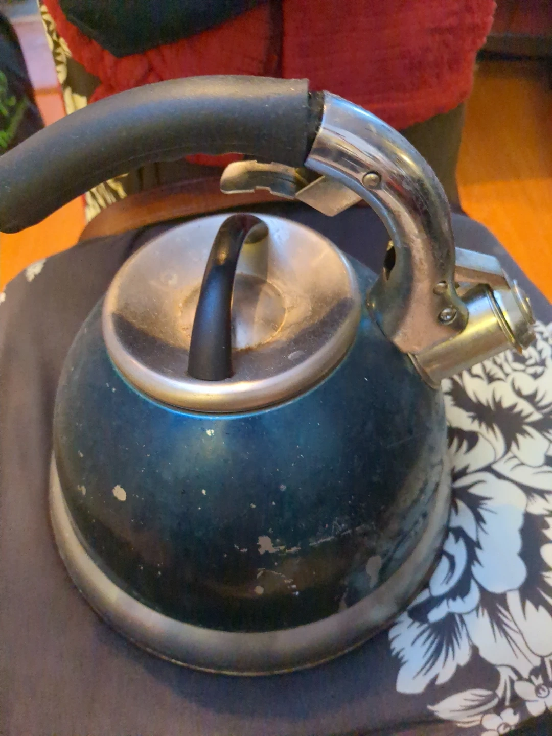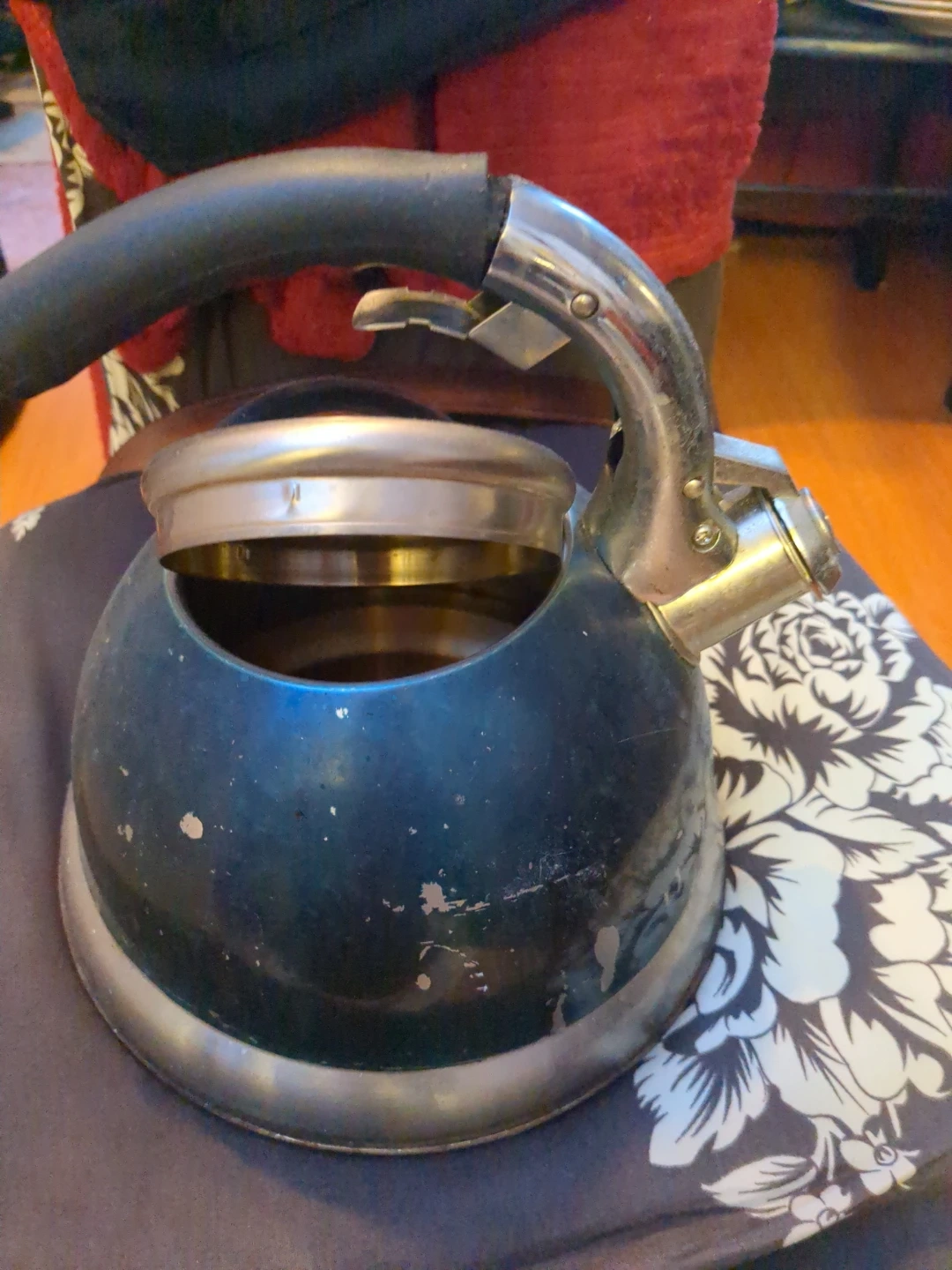 A classic stovetop kettle with a shiny chrome spout and handle accents. It's a deep blue colour and features a sturdy black handle for easy pouring. This kettle's great for making your morning brew!