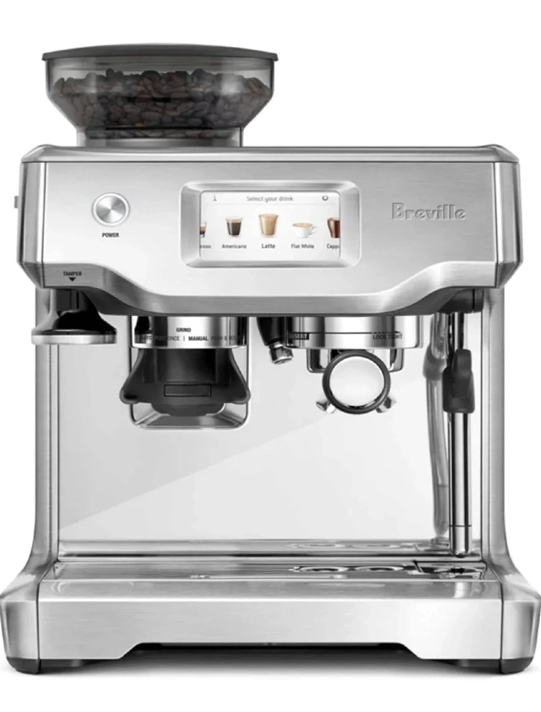 This Breville espresso machine features a built-in grinder and a touch screen for selecting drinks. It's designed for making espresso, Americano, latte, flat white, and cappuccinos. The stainless steel finish gives it a sleek look. Perfect for a home barista who wants to craft their favourite coffee drinks!